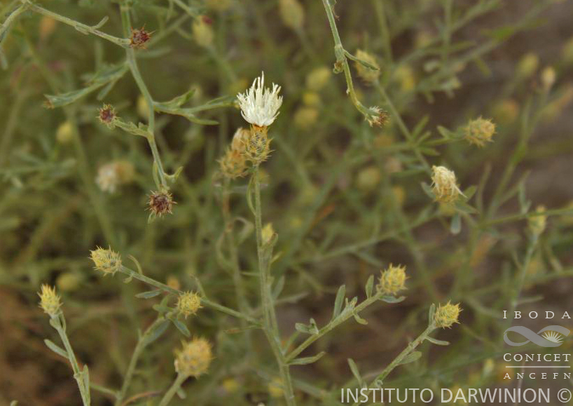 Hierbas anuales o bienales, hasta de 50(-60) cm de alto, muy ramificadas, con tallos estriados, divaricados, muy laxamente tomentulosos o glabrescentes. Hojas sésiles o inscospicuamente pecioladas, las basales arrosetadas, caducas, con láminas de contorno obovado o elíptico, pinnatisectas o bipinnatisectas, ca. 3-6 × 2 cm, con hasta 8-9 pares de segmentos elípticos, ovados u obovados, ca. 1-1,5 cm × 2-5 mm, las superiores con láminas de contorno obovado y pinnatisectas, de 4-6,5 × 3 cm, generalmente con 3-4 pares de segmentos angostamente elípticos o lineares, ca. 1,5 cm × 2 mm, base decurrente, ápice agudo, y margen entero, o lineares, ca. 1-1,5 cm × 1 mm, laxamente albo-tomentosas en ambas superficies. Capítulos heterógamos y subdiscoides, solitarios en el extremo de las ramas, sésiles o subsésiles. Involucro ovoide o cilíndrico, de 9-10 × 4-5 mm, 7-8-seriado; filarios coriáceos, los externos ovados, ca. 3 × 1 mm, margen pectinado, con una espina terminal apenas diferenciada, los medios ovados o angostamente ovados, de 5-8 × 1-2 mm, margen de la mitad superior pectinado, ápice subulado, con una espina terminal diferenciada de 1-2 mm de largo, y los internos oblongos, de 9-10 × 1 mm, ápice obtuso, a veces diminutamente aserrado, margen membranáceo, no espinoso. Receptáculo plano, con numerosas cerdas hasta de 5 mm de largo. Flores 20-30, dimorfas, las del margen neutras, con corolas radiantes, de 1,3-1,5 cm de largo, blancas, cremosas o rosadas y lóbulos ca. 5 mm de largo, las del centro perfectas, con corolas ca. 1,1 cm de largo, blancas, cremosas o rosadas y lóbulos de 4-5 mm de largo. Aquenios obovoides u oblongoides, ca. 3 × 1 mm, muy ligeramente estriados, con un reborde apical, pardos, glabros. Papus ausente.