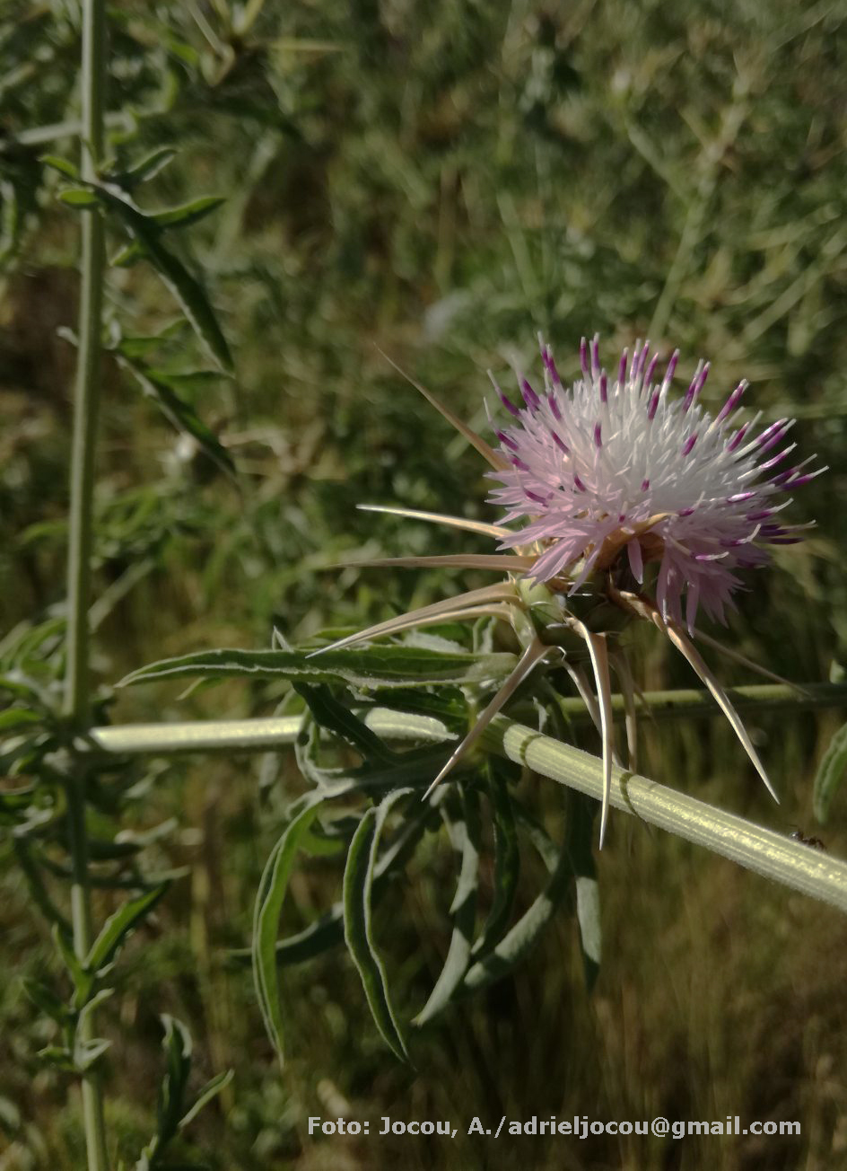 Hierbas anuales o bienales, hasta de 1,5 m de alto, ramificadas desde la base, con tallos divaricados, estriados, grabrescentes. Hojas basales arrosetadas, caducas, las inferiores con pecíolos insconspicuos hasta de 2-3,5 cm de largo, láminas de contorno obovado, de 16-18,5(-25) × 9-10,5 cm, pinnatífidas (o bipinnatífidas), con segmentos sésiles oblongos, o de contorno ovado y partidos, hasta de 5 cm de largo, margen entero, denticulado o serrulado, ápice agudo, laxamente hirsutas; hojas superiores menores. Capítulos heterógamos y subdiscoides, solitarios en el extremo de las ramas o axilas de ramificaciones, sésiles o subsésiles. Involucro ovoide o globoso, de 14-15 × 11- 12 mm (sin considerar las espinas de los filarios), 5-6-seriado; filarios externos y medios coriáceos, con espina terminal rígida, acanalada en la superficie interna y divergente, los externos anchamente ovados, ca. 5 × 4 mm, con espina hasta de 5 mm de largo y con 1-2 pares de pequeñas espinas en la base, los medios ovados, ca. 7 × 5 mm, con espina de 1,5-2,5 cm de largo y con 2(-3) pares de espinas más cortas en su base, los internos angostamente ovados u oblongos, de 1-1,2 cm × 3 mm, con un apéndice apical membranáceo obovado, a veces eroso o subentero, todos glabros. Receptáculo plano, con numerosas cerdas, hasta de 1,2 cm de largo. Flores ca. 30, dimorfas, las del margen neutras, con corolas subradiantes, ca. 2 cm de largo, irregularmente lobuladas y zigomorfas, purpúreas o rosadas y con lóbulos de 5-6 mm de largo, las del centro perfectas, con corolas de 1,8-1,9 cm de largo, purpúreas o rosadas, y lóbulos ca. 4 mm de largo. Aquenios oblongoides, de 3-3,5 × 1,5-2 mm, algo comprimidos, blancuzcos o con líneas longitudinales grisáceas, glabros. Papus 2-3-seriado, formado por pajitas planas, desiguales, las externas, ca. 1 mm de largo y las internas ca. 2 mm de largo.