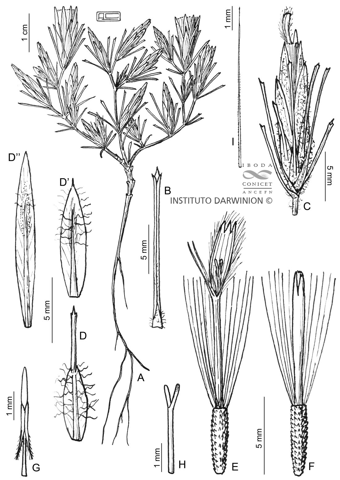 A. Planta. B. Hoja. C. Capítulo. D. Filarios. E. Flor del margen. F. Flor del centro. G. Estambre. H. Parte superior del estilo. I. Cerda del papus.