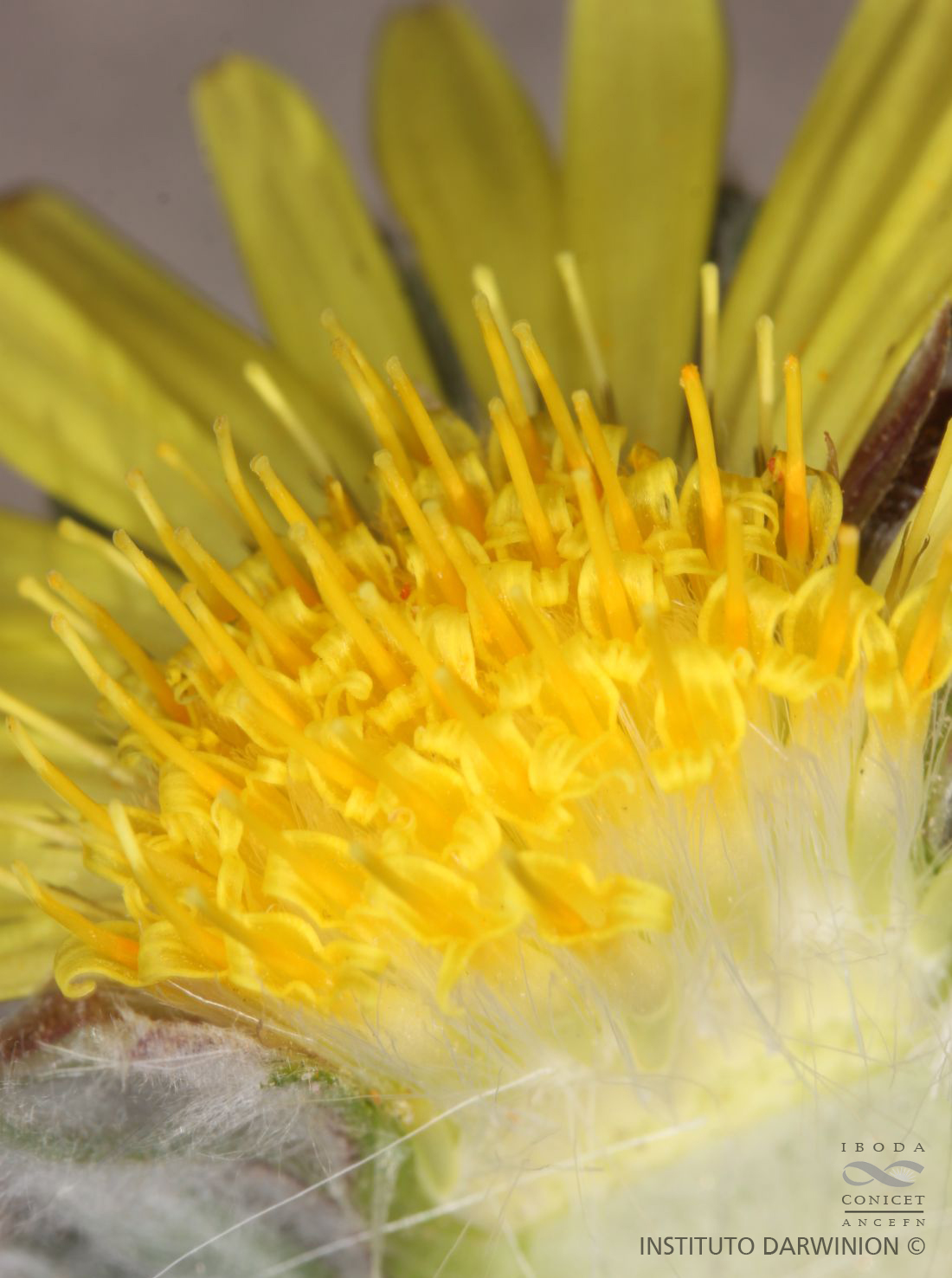 Hierbas perennes, bajas, de 5-8 cm de alto, densamente lanosas, con rizoma largo, grueso, ramificado, monoicas; tallos cortos, simples o apenas ramificados, delgados, densamente hojosos, especialmente en la base de los capítulos. Hojas inferiores lineares, de 4-6 × 2 mm, obtusas en el ápice, las superiores atenuadas en la base en pseudopecíolo linear, de 12- 14 × 6-7 mm y dilatadas en la porción superior en una lámina espatulada, de 4-6 × 6-7 mm, truncadas en el ápice, con márgenes engrosados, densamente seríceo-lanosas en ambas caras. Capítulos heterógamos, radiados, sésiles, solitarios en el ápice de los tallos, rodeados por algunas hojas. Involucro hemisférico, de 20-25 × 25-30 mm; filarios 2-3-seriados, los externos lineares, espatulados en la parte superior, de 20 × 1 mm (en la parte media), con bordes membranáceos hacia la base y ápice agudo, lanosos, los internos lanceolados, de 21-22 × 3 mm, largamente acuminados y lanosos en el ápice, con bordes membranáceos. Flores dimorfas, las del margen 20-30, pistiladas, con corola amarilla y rojiza en el dorso, bilabiada, con tubo de 6 mm de largo, labio exterior liguliforme, de 13-14 × 2 mm, labio interior 2-fido, muy corto, las del centro 50-70, perfectas, con corola amarilla, bilabiada, tubo de 10 mm de largo y labios de 2 mm de largo, el exterior 3- dentado y el interior 2-fido; ramas del estilo de 0,3 mm de largo. Aquenios cilindroides, de 8-9 mm de largo, glabros a veces espaciadamente pilosos, con cortos pelos dobles. Papus de 11- 13 mm de largo, blanco.