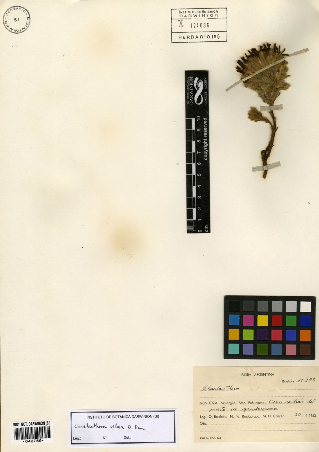 Hierbas perennes, bajas, de 5-7 cm de alto, densamente seríceovelludas, con rizoma largo, monoicas; tallos muy cortos o casi nulos, densamente hojosos especialmente en la base de los capítulos. Hojas oblanceolado-espatuladas, de 13-22 × 3-4 mm, atenuadas en la base, obtusas y con 3-5 dientes en el ápice, densamente seríceolanosas en ambas caras. Capítulos heterógamos, radiados, sésiles, solitarios en el ápice de los tallos, rodeados por algunas hojas. Involucro hemisférico, de 20-25 × 25-30 mm; filarios 2-3-seriados, los externos lineares en la parte superior, de 19-20 × 1 mm (en la parte media), con bordes membranáceos en la base y ápice agudo, densamente seríceo-pubescentes, los internos lanceolados, de 23- 27 × 3-4 mm, agudos en el ápice, con bordes membranáceos, laxamente seríceos. Flores dimorfas, las del margen 20-35, pistiladas, con corola amarilla, bilabiada, tubo de 8-10 mm de largo, labio exterior liguliforme, de 14-15 × 2-3 mm, labio interior 2-fido, de 2-3,5 mm de largo, las del centro ca. 50, perfectas, con corola amarilla, bilabiada, tubo de 12-15 mm de largo y labios de 3 mm de largo, el exterior 3- dentado y el interior 2-fido; ramas del estilo de 0,5 mm de largo. Aquenios cilindroides, de 8 mm de largo, glabros a veces espaciadamente pilosos, con pelos dobles, globosos. Papus de 13-15 mm de largo, blanco.