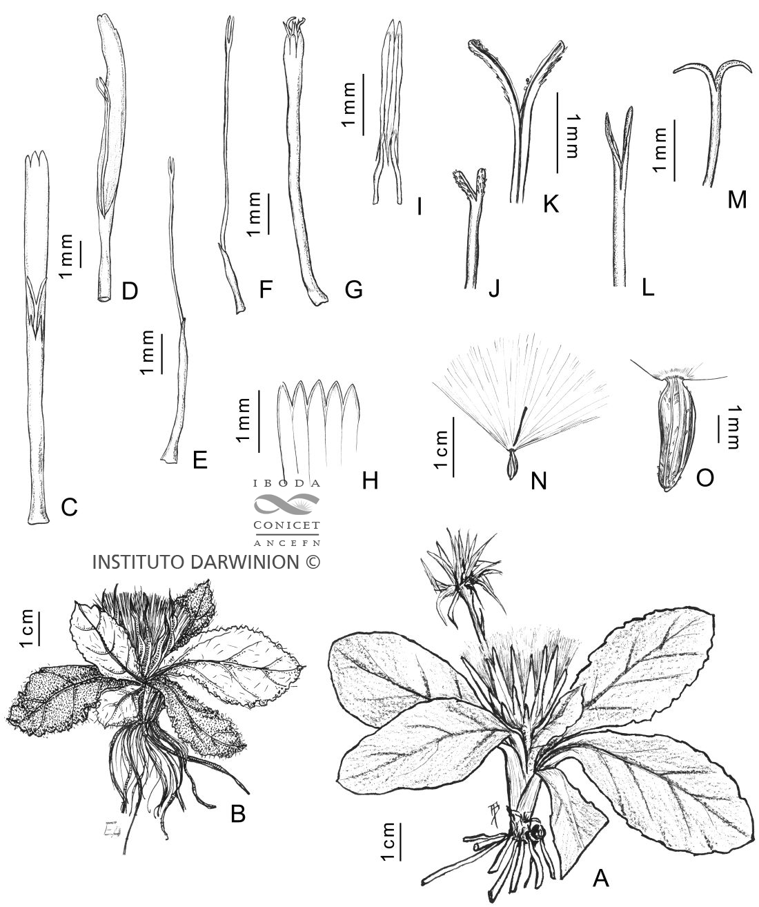 A-B. Plantas. C-D. Flores del margen (ovarios no dibujados). E-F. Flores intermedias (ovario no dibujado). G. Flor del centro (ovario no dibujado). H. Corola de la flor del centro abierta. I. Estambres. J-K. Parte superior del estilo de la flor del centro. L-M. Parte superior del estilo de la flor del margen. N. Aquenio, papus y restos de la corola seca. O. Aquenio y papus (recortado).