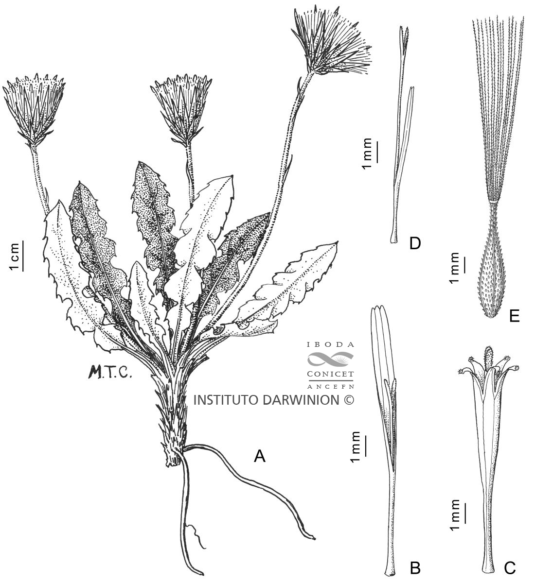 A. Planta. B. Flor del margen (ovario no dibujado). C. Flor del centro (ovario no dibujado). D. Flor intermedia (ovario no dibujado). E. Aquenio y papus.