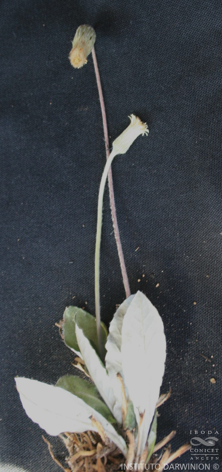 Hierbas perennes, con rizoma breve y raíces adventicias crasas de color rojizo. Hojas en roseta, obovadas o elípticas, 6- 12 × 2,5-5 cm, atenuadas en la base en un corto pseudopecíolo, obtusas o subagudas en el ápice, retrorso-aserradas o ligeramente sinuadas en el margen, discoloras, glabrescentes o lanuginosas, de color verde en la cara superior y blanco-tomentosas en la inferior. Capítulos solitarios, nutantes cuando jóvenes y al fructificar (erguidos en la antesis), en el extremo de un escapo floral de 7-35 cm de largo, tomentoso, con 1-3 brácteas linearsubuladas, a veces ausentes. Involucro acampanado, de 14-25 × 10-15 mm; filarios pluriseriados, tomentosos en el dorso. Flores numerosas, trimorfas, con corolas blancas o rosadas, las del margen 1-seriadas, pistiladas, con corolas subliguladas, ca. 15 mm de largo, las siguientes numerosas, pistiladas, con corolas filiformes, ca. 8 mm de largo y estilo apenas más largo que la corola; las del centro perfectas, con corolas tubuloso-bilabiadas, ca. 11 mm de largo. Aquenios fusiformes, de 13-16 mm de largo, 5- costados, rostro de 9-11 mm de largo, cortamente pubescentes. Papus blanco-sedoso, de 12-15 mm de largo.