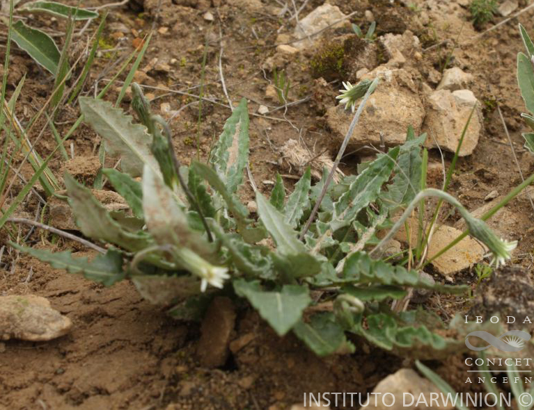 Hierbas perennes, con rizoma breve y raíces adventicias crasas de color rojizo. Hojas en roseta, obovadas o elípticas, 6- 12 × 2,5-5 cm, atenuadas en la base en un corto pseudopecíolo, obtusas o subagudas en el ápice, retrorso-aserradas o ligeramente sinuadas en el margen, discoloras, glabrescentes o lanuginosas, de color verde en la cara superior y blanco-tomentosas en la inferior. Capítulos solitarios, nutantes cuando jóvenes y al fructificar (erguidos en la antesis), en el extremo de un escapo floral de 7-35 cm de largo, tomentoso, con 1-3 brácteas linearsubuladas, a veces ausentes. Involucro acampanado, de 14-25 × 10-15 mm; filarios pluriseriados, tomentosos en el dorso. Flores numerosas, trimorfas, con corolas blancas o rosadas, las del margen 1-seriadas, pistiladas, con corolas subliguladas, ca. 15 mm de largo, las siguientes numerosas, pistiladas, con corolas filiformes, ca. 8 mm de largo y estilo apenas más largo que la corola; las del centro perfectas, con corolas tubuloso-bilabiadas, ca. 11 mm de largo. Aquenios fusiformes, de 13-16 mm de largo, 5- costados, rostro de 9-11 mm de largo, cortamente pubescentes. Papus blanco-sedoso, de 12-15 mm de largo.