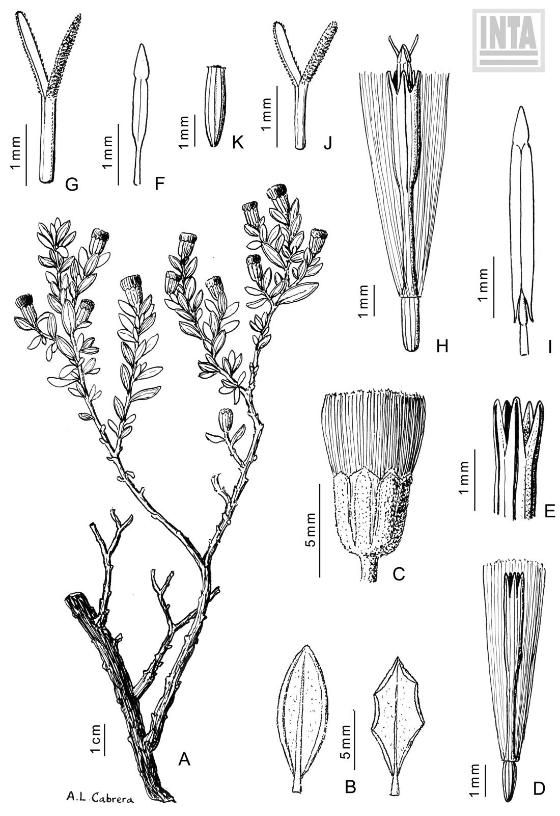 Arbustitos dioicos, raramente polígamo-dioicos, de 10-40 cm de alto; ramas densamente hojosas hasta el ápice. Hojas cortamente pecioladas; pecíolos de 1-3 mm de largo; láminas elípticas o elíptico-lanceoladas, de 5-20 × 1,5-5 mm, atenuadas en la base, agudas en el ápice, revolutas y enteras en el margen, raramente con algún diente. Capítulos solitarios, subsésiles, sobre ramas cortas. Involucro de 3-6 × 3-4 mm, de la mitad del largo de las flores, ecaliculado o apenas caliculado con 1-2 bractéolas lineares; filarios 8, ovado-oblongos, agudos y penicilados en el ápice, membranáceos en los bordes y tomentosos en el dorso. Capítulos estaminados: flores isomorfas 12-15, corolas amarillentas, tubulosas, ca. 7 mm de largo, 5-lobadas, lóbulos de 0,7-1 mm de largo; ovario estéril. Capítulos pistilados: flores isomorfas 10-20, corolas amarillentas, estrechamente tubulosas, 5-lobadas, lóbulos de 1-1,5 mm de largo; anteras rudimentarias. Aquenios cilíndricos, de 2,5 mm de largo, costados, glabros. Papus de 6,5-7,5 mm de largo, amarillento o rojizo.