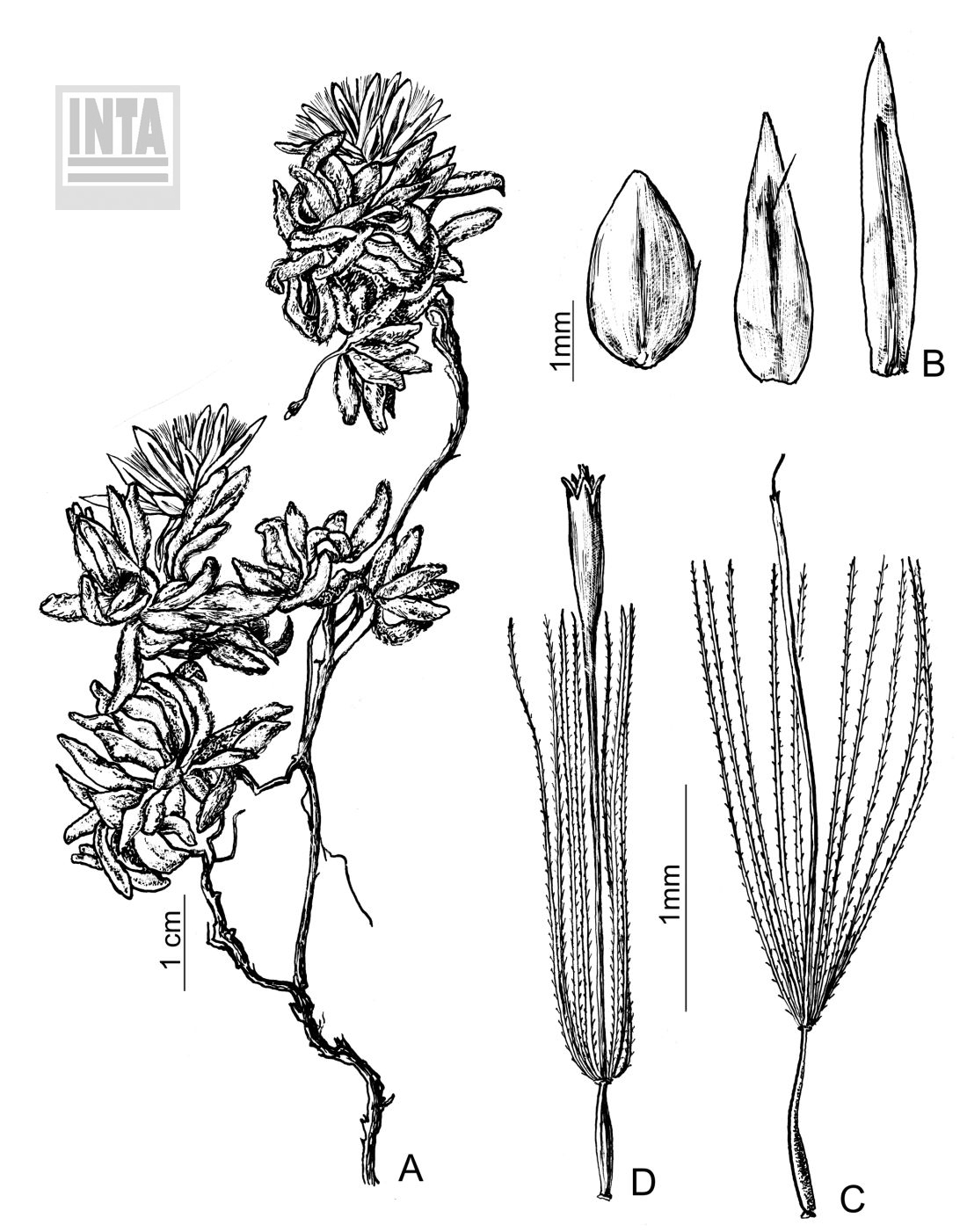 Hierbas perennes, pigmeas, multicaules. Tallitos rastreros, delgados, densamente hojosos, de 5-6 cm de largo. Hojas opuestas y unidas entre sí en la base, lanceoladas, de 8-16 × 2-3 mm, agudas y mucronadas en el ápice, atenuadas en la base, laxamente lanosas en la cara superior y densamente lanosas en la inferior. Capítulos solitarios en el ápice de los tallitos, primero sésiles y luego sostenidos por un largo y delgado pedúnculo áfilo y lanoso, hasta de 7 cm de largo. Involucro cilíndrico, de 8- 10 × 3 mm; filarios 3-4-seriados, los externos ovados, obtusos, lanuginosos en el dorso, los internos oblongo-lineares, obtusos, glabros. Flores con corola de color blanco-crema, las del margen numerosas, corolas filiformes, ca. 3 mm de largo, las del centro pocas, corolas tubulosas, ca. 3,5 mm de largo. Aquenios fusiformes, ca. 1,5 mm de largo, cortamente pilosos, contraídos en el ápice en un rostro delgado ca. 1,5 mm de largo. Papus de igual longitud o apenas más cortos que las corolas.