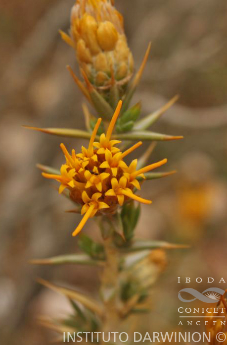 Arbustos de 30-50 cm de alto, intrincado, con ramitas jóvenes amarillentas, pubérulas, sin espinas axilares. Hojas alternas, sésiles, abiertas y rectas, lanceoladas, de 10-25 × 1,5-3 mm, subulado-espinosas en el ápice, involutas, levemente abrazadoras en la base, tomentosas en la haz, glabras y lustrosas en el envés, sin nervios prominentes, con el margen levemente engrosado. Capítulos sésiles, solitarios y terminales en el extremo de las ramitas (a veces seudo-axilares por ser éstas muy cortas). Involucro cilíndrico-turbinado, de 1,3-1,6 × 0,8-1,2 cm; filarios en 4-6 series, amarillos, todos más o menos erectos, fuertemente coriáceo-escariosos, frecuentemente lustrosos, con el margen ciliado a glabro. Flores 12-23, con corola de de 8-10 mm, exteriormente pubescente, sobre todo hacia el ápice, con un segmento más profundo. Aquenios de 3-4 mm de largo. Papus algo más corto que la corola.