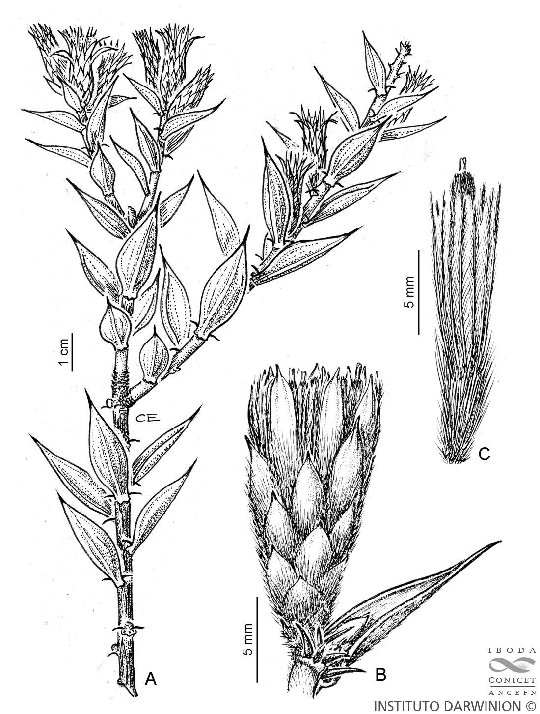 Arbustos de 50-100 cm de alto, hemisféricos, intrincadoramosos, espinosos, con ramitas jóvenes amarillentas, pubérulas a glabras, con espinas axilares de 3-6 mm, robustas. Hojas alternas, subsésiles, ovadas, de 10- 30 × 5-10 mm, coriáceas a rígidas, agudas y espinescentes en el ápice, glabras a pubérulas, trinervadas, con el margen engrosado. Capítulos sésiles, terminales y axilares. Involucro cilíndrico-acampanado de 2-2,5 × 0,5-1 cm; filarios en 5-7 series, amarillos, ovados a lanceolados o lineales, los internos radiantes, todos glabros. Flores 8-15, con corolas de de 10-13 mm de largo, exteriormente pubescentes hacia el ápice, con un segmento más profundo, Aquenios ca. 4 mm de largo. Papus ca. la misma longitud que la corola.