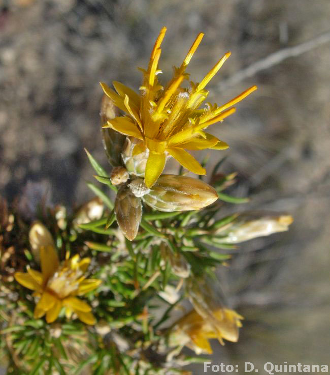 Arbustos de 40-150 cm de alto, erguidos, con ramitas erectas, pardo-cenicientas, pubérulas, sin espinas axilares. Hojas alternas, sésiles, aciculares, de 5-30 × 0,5-3 mm, incurvadas a rectas y rígidas, subulado-espinosas en el ápice, con surco tomentoso en el haz, generalmente glabras en el envés, sin nervios prominentes. Capítulos sésiles, terminales. Involucro cilíndrico, de 1,2-2,5 cm × 3-8 mm; filarios en 5-7 series, amarillos, ovadolanceolados a oblongo-lanceolados, todos levemente incurvados o recurvados en el ápice, pubérulos o glabros, los interiores radiantes a la madurez. Flores 5-13, con corolas de 6- 10 mm, seríceo-pubescentes, con segmentos subiguales. Aquenios de 3 mm de largo. Papus más corto o casi tan largo como la corola.
