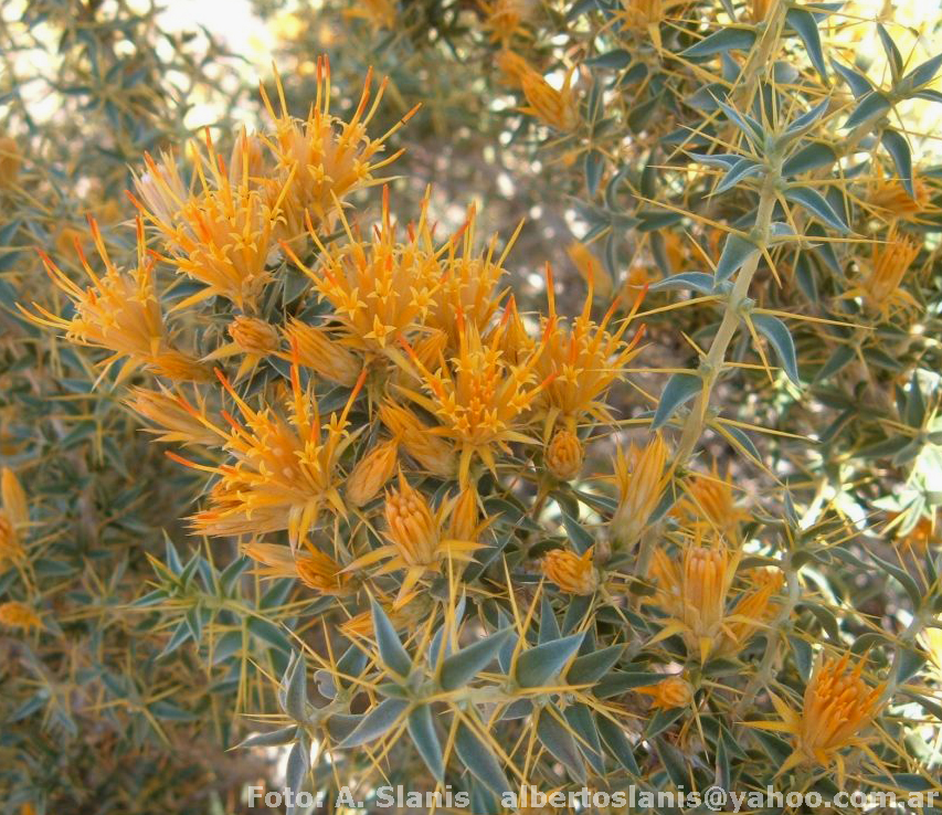 Arbustos de 50-100 cm de alto, intrincado-ramosos, las ramitas superiores incano pubescentes, con espinas axilares de 5-15(-25) mm de largo. Hojas opuestas, subsésiles, ovadas a lanceoladas, de 10-20(-25) × 3-6(-8) mm, coriáceas, agudas y espinosas en el ápice, incano-seríceas en ambas caras, 3-nervadas, con el margen engrosado. Capítulos sésiles, terminales o seudoaxilares. Involucros cilíndrico-turbinado de 1,5-2 × 0,5-1 cm; filarios en 4-6 series, amarilloanaranjados, angostamente ovados u oblongos a lanceolados o lineales, todos erectos y seríceos. Flores 8-15, con corolas de 11-13 mm de largo, pubescentes, con segmentos subiguales. .Aquenios de 3-4 mm de largo. Papus similar en largo al de la corola.