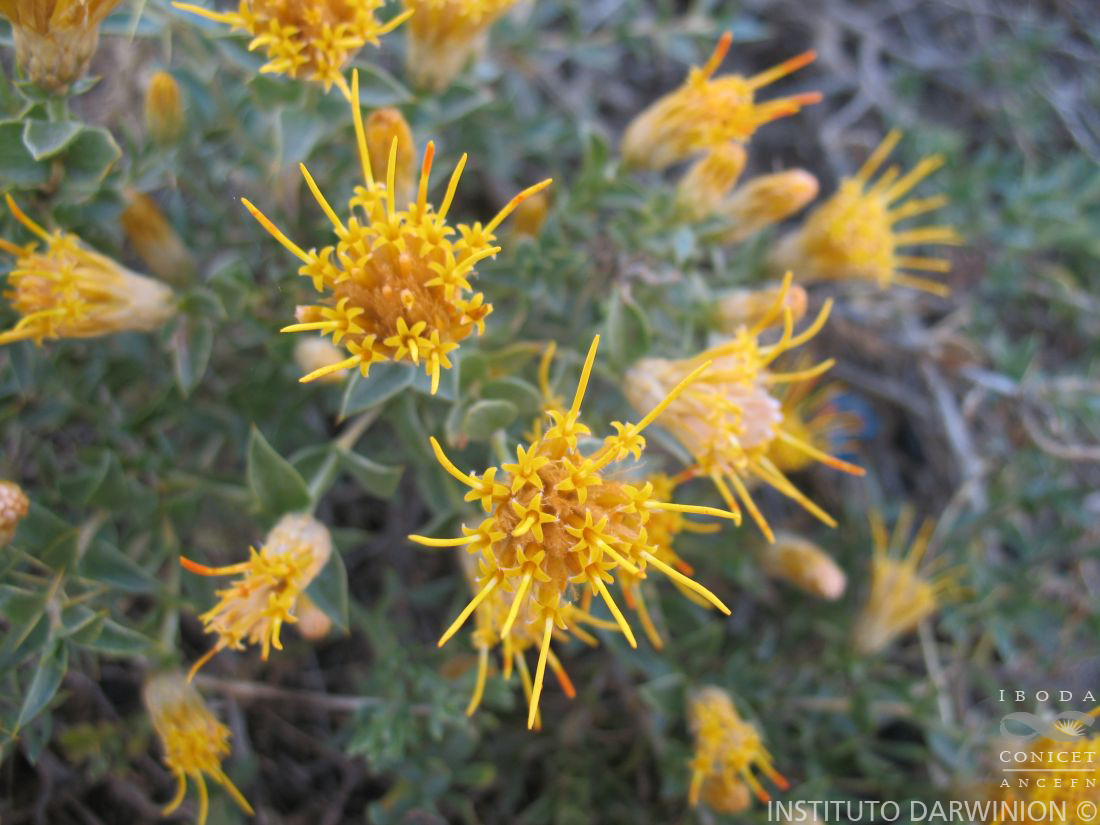 Arbustos de 50-100 cm de alto, intrincado-ramosos, las ramitas superiores incano pubescentes, con espinas axilares de 5-15(-25) mm de largo. Hojas opuestas, subsésiles, ovadas a lanceoladas, de 10-20(-25) × 3-6(-8) mm, coriáceas, agudas y espinosas en el ápice, incano-seríceas en ambas caras, 3-nervadas, con el margen engrosado. Capítulos sésiles, terminales o seudoaxilares. Involucros cilíndrico-turbinado de 1,5-2 × 0,5-1 cm; filarios en 4-6 series, amarilloanaranjados, angostamente ovados u oblongos a lanceolados o lineales, todos erectos y seríceos. Flores 8-15, con corolas de 11-13 mm de largo, pubescentes, con segmentos subiguales. .Aquenios de 3-4 mm de largo. Papus similar en largo al de la corola.