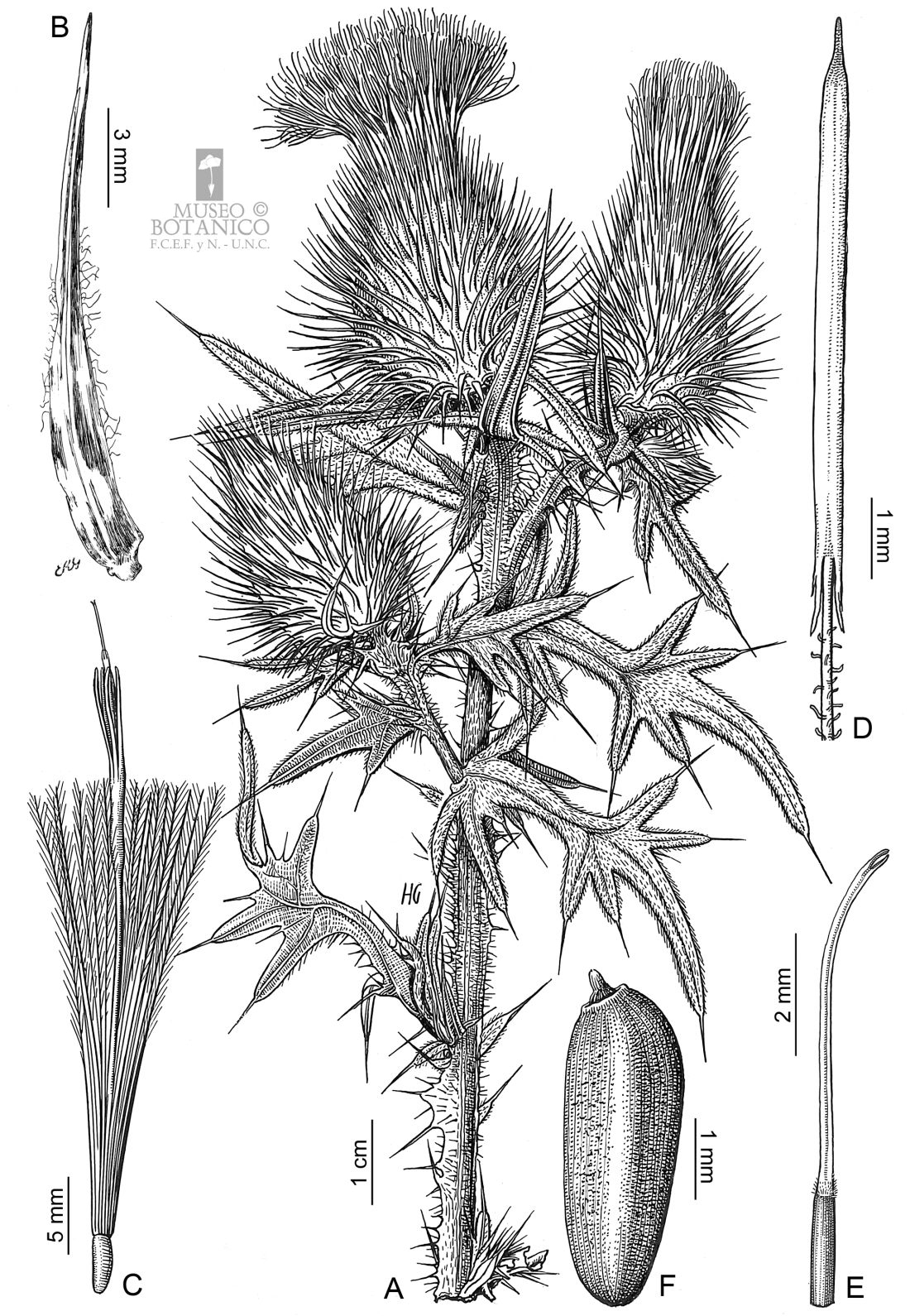Hierbas anuales o bienales, rizomatosas, de 0,5-2 m de alto, con ramas ascendentes. Tallos erectos, alados (alas dentadoespinosas). Hojas sésiles, oblanceoladas u obovadas, base decurrente, profundamente pinnatífidas, segmentos terminados en espina, lámina discolor, epifilo verde-obscuro con espinitas cortas y adpresas, hipofilo gris-tomentoso, con las nervaduras visibles. Capítulos grandes, pedunculados o subsésiles, solitarios, en glomérulos o en cimas laxas. Involucro globoso u ovoideo, de 25-40 × (15-)18-30 mm; filarios numerosos, lineares o lanceolados, los más externos con la base ensanchada, nervadura central conspicua, todos laxamente lanuginosos, terminados en larga espina y algo divergentes. Flores perfectas, corola purpúrea, violácea o rosada, limbo 5-secto. Aquenios cilíndricos a obovoides, de 3,5-4,8 mm de largo, ligeramente asimétricos, con borde superior oblicuo, glabros, amarillentos y con manchitas o estrías longitudinales color castaño, estilopodio conspicuo. Papus formado por pelos plumosos, unidos por la base.