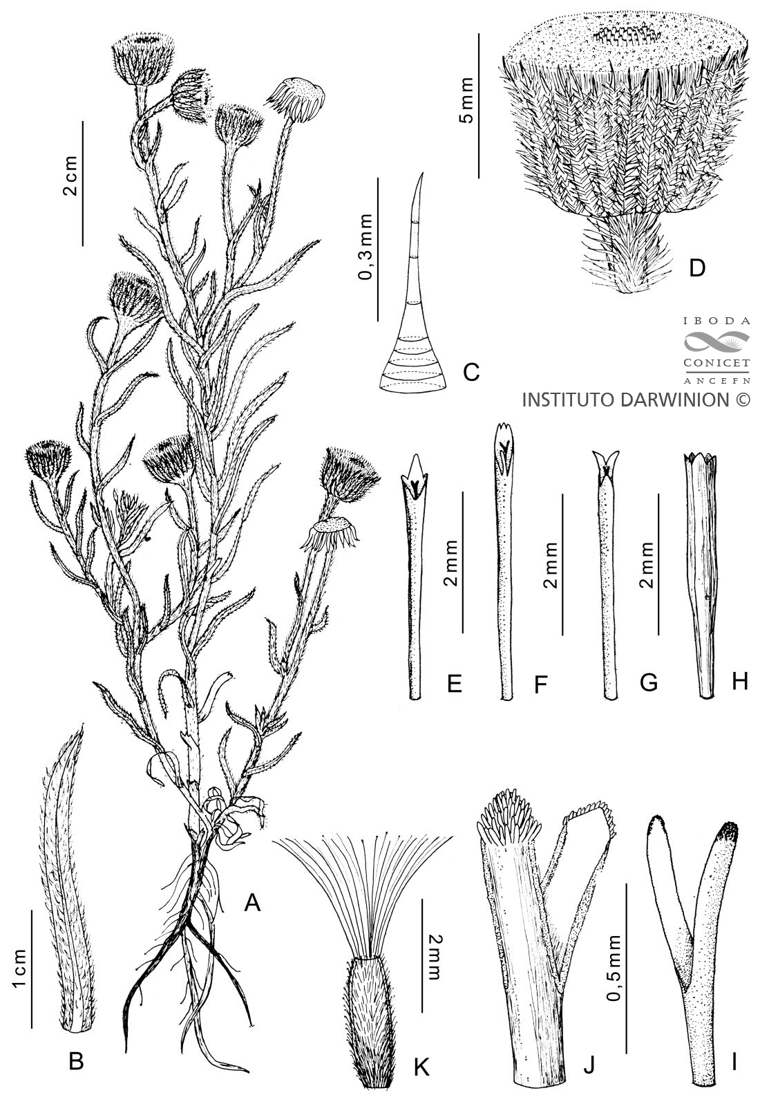A. Planta. B. Hoja inferior. C. Pelo del involucro. D. Capítulo. E, F, G. Flor del margen. H. Flor del centro. I. Estilo de la flor del margen (sección). J. Estilo de la flor del centro (sección). K. Aquenio con papus.