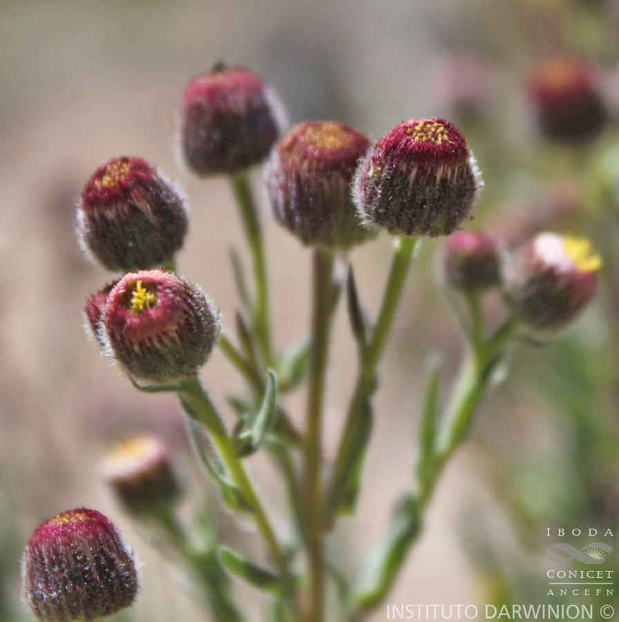 Hierbas perennes, hasta de 30 cm de alto; raíz principal engrosada; varios tallos arqueados hacia arriba, simples, hojosos, hirsutos a pilosos. Hojas obovadas, de 10-80 × 1,5-10 mm, base largamente atenuada, ápice obtuso a subagudo, margen entero, hirsutas en ambas caras, las inferiores en roseta, las superiores gradualmente menores. Capítulos 2 a 10 por eje, ca. 6 × 7-8 mm, pedunculados, agrupados en inflorescencias secundarias corimbiformes terminales densas. Involucro hemisférico con filarios subiguales dispuestos en 2 ó 3 series, a veces los externos más cortos, lineares, de 3,5-4,9 × 0,7-0,8 mm, agudos, hirsutos, con pelos largos. Flores marginales en 3 ó 4 series, con corola filiforme, de 2,8-3 mm de largo, de igual longitud o apenas más larga que los filarios, sin limbo desarrollado, ápice dentado; flores del centro pocas, con corola tubuloso-campanulada, de 3,2-3,5 mm de largo. Aquenios de 1-2 × 0,4 mm, laxamente seríceos. Papus de 2,7-3,5 mm de largo.