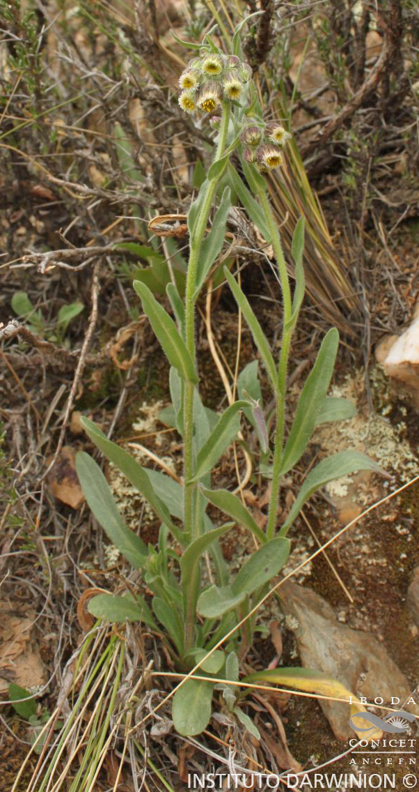 Hierbas perennes, hasta de 30 cm de alto; raíz principal engrosada; varios tallos arqueados hacia arriba, simples, hojosos, hirsutos a pilosos. Hojas obovadas, de 10-80 × 1,5-10 mm, base largamente atenuada, ápice obtuso a subagudo, margen entero, hirsutas en ambas caras, las inferiores en roseta, las superiores gradualmente menores. Capítulos 2 a 10 por eje, ca. 6 × 7-8 mm, pedunculados, agrupados en inflorescencias secundarias corimbiformes terminales densas. Involucro hemisférico con filarios subiguales dispuestos en 2 ó 3 series, a veces los externos más cortos, lineares, de 3,5-4,9 × 0,7-0,8 mm, agudos, hirsutos, con pelos largos. Flores marginales en 3 ó 4 series, con corola filiforme, de 2,8-3 mm de largo, de igual longitud o apenas más larga que los filarios, sin limbo desarrollado, ápice dentado; flores del centro pocas, con corola tubuloso-campanulada, de 3,2-3,5 mm de largo. Aquenios de 1-2 × 0,4 mm, laxamente seríceos. Papus de 2,7-3,5 mm de largo.