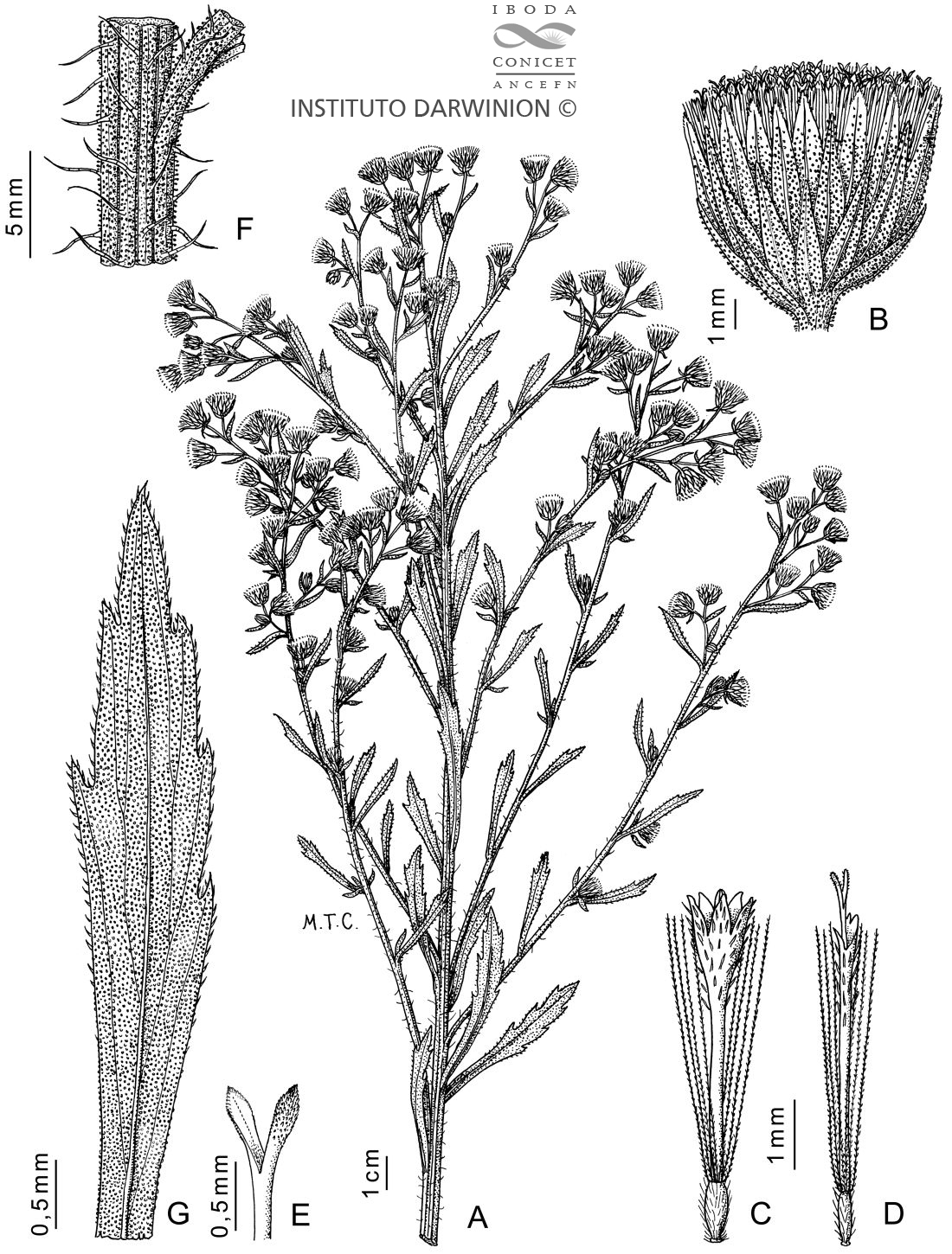 Hierbas anuales, de 1-2 m alto; raíz principal desarrollada; tallos generalmente únicos, ramificados, hojosos, hirsutos, densamente cubiertos por pelos glandulares. Hojas de 40-90 × 8- 12 mm, base atenuada, ápice agudo, glandulosas en ambas caras, estrigosas en el margen y nervio medio, las inferiores angostamente obovado-elípticas, margen serrado a profundamente serrado, las superiores lineares, margen entero. Capítulos generalmente más de 15 por eje, de 7-8 × ca. 8 mm, pedunculados, dispuestos en inflorescencias secundarias paniculiformes amplias. Involucro hemisférico con filarios de diferente longitud dispuestos en 2 ó 3 series, ovado-lineares, de 4,5-5,5 × 0,7-1 mm, agudos y densamente glandulosos. Flores marginales en 3 ó 4 series, con corola filiforme, de 4,2-5,5 mm de largo, de igual longitud o apenas más larga que los filarios, sin limbo desarrollado, ápice dentado; flores del centro pocas, con corola tubuloso-campanulada, de 4-5,4 mm de largo. Aquenios de 1,2-1,5 × 0,3-0,4 mm, subglabros. Papus ca. 4,5 mm de largo.