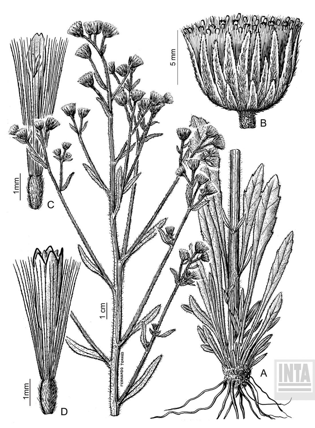 Hierbas anuales, hasta de 1 m de alto; raíz principal desarrollada; tallos a menudo varios, simples, esparcidamente hojosos e hirsutos a pilosos. Hojas de 60-100 × ca. 10 mm, ápice subobtuso a agudo, laxamente estrigosas en ambas caras o.subglabras, las inferiores concentradas en la base, obovadas, de base largamente atenuada y margen lobado o serrado, las superiores linear-oblongas, gradualmente menores, margen entero. Capítulos más de 50 por eje, de (4-)6-7 × 6-7 mm, pedunculados, dispuestos en inflorescencias secundarias corimbiformes (o menos comúnmente paniculiformes) amplias. Involucro acampanado con filarios desiguales dispuestos en 2 ó 3 series, linear-ovados, de 3-6 × 0,4-0,8 mm, agudos, glabrescentes. Flores marginales en 3 ó 4 series, con corola filiforme, de 3,5-3,8 mm de largo, de igual longitud o apenas más larga que los filarios, limbo desarrollado (de 1-1,5 mm de largo), ápice emarginado o dentado; flores del centro pocas, con corola tubulosocampanulada, ca. 3,5 mm de largo. Aquenios de 1-2-1,6 × ca. 0,5 mm, laxamente seríceos. Papus de 3-3,4 mm de largo.