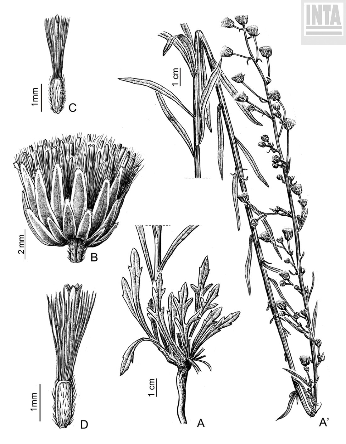 A, A’. Planta. B. Capítulo. C. Flor del margen. D. Flor del centro.