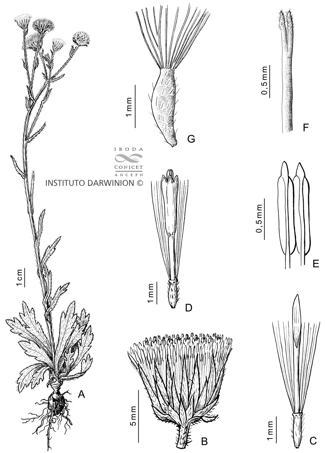 A. Planta. B. Capítulo. C. Flor del margen. D. Flor del centro. E. Estambres. F. Estilo (sección). G. Aquenio con papus.