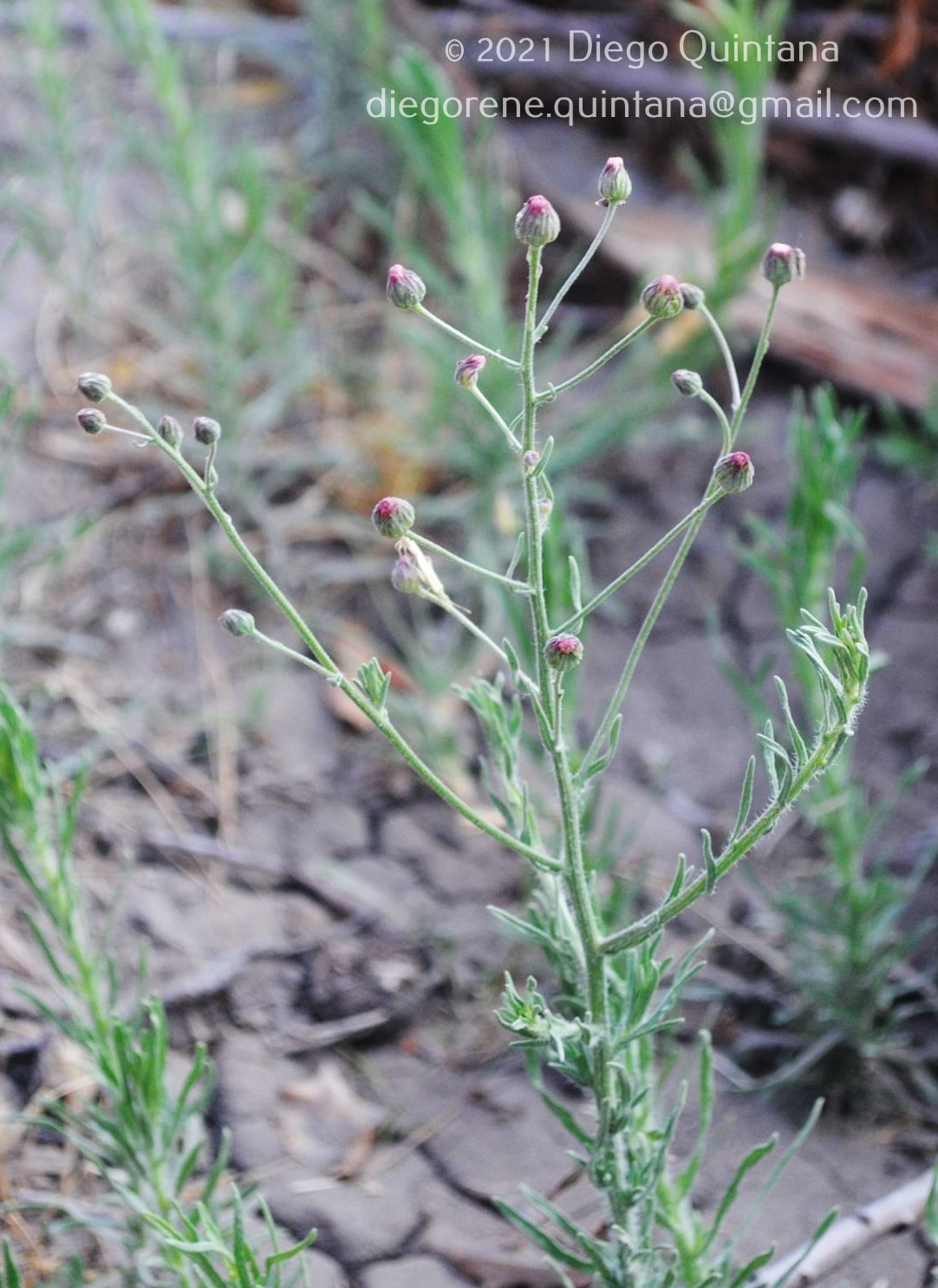 Subarbustos, hasta de 30 cm de alto, ramificados en la base; raíz principal desarrollada; tallos varios, simples, hojosos, laxamente estrigosos. Hojas uniformemente distribuidas en el tallo, linear-elípticas, de 15-50 × 1-3 mm, base atenuada, ápice subagudo, margen entero, laxamente estrigosas, las superiores de similar tamaño a gradualmente menores. Capítulos 8 a ca. 20 por eje, de 5-6 × 3-5 mm, pedunculados, dispuestos en una inflorescencia secundaria laxa paniculiforme o racemiforme. Involucro acampanado con filarios gradualmente menores, dispuestos en 3 ó 4 series, linear-ovados, de 2-4,5 × 0,5-0,7 mm, agudos, laxamente estrigosos. Flores marginales en 2 ó 3 series, con corola filiforme, de 3-3,2 mm de largo, de igual longitud o apenas más larga que los filarios, con limbo corto (ca. 0,5 mm), ápice emarginado; flores del centro pocas, con corola tubulosocampanulada, ca. 3 mm de largo. Aquenios de 2-2,4 × 0,5-0,6 mm, laxamente seríceos. Papus de 3,3-4 mm de largo.