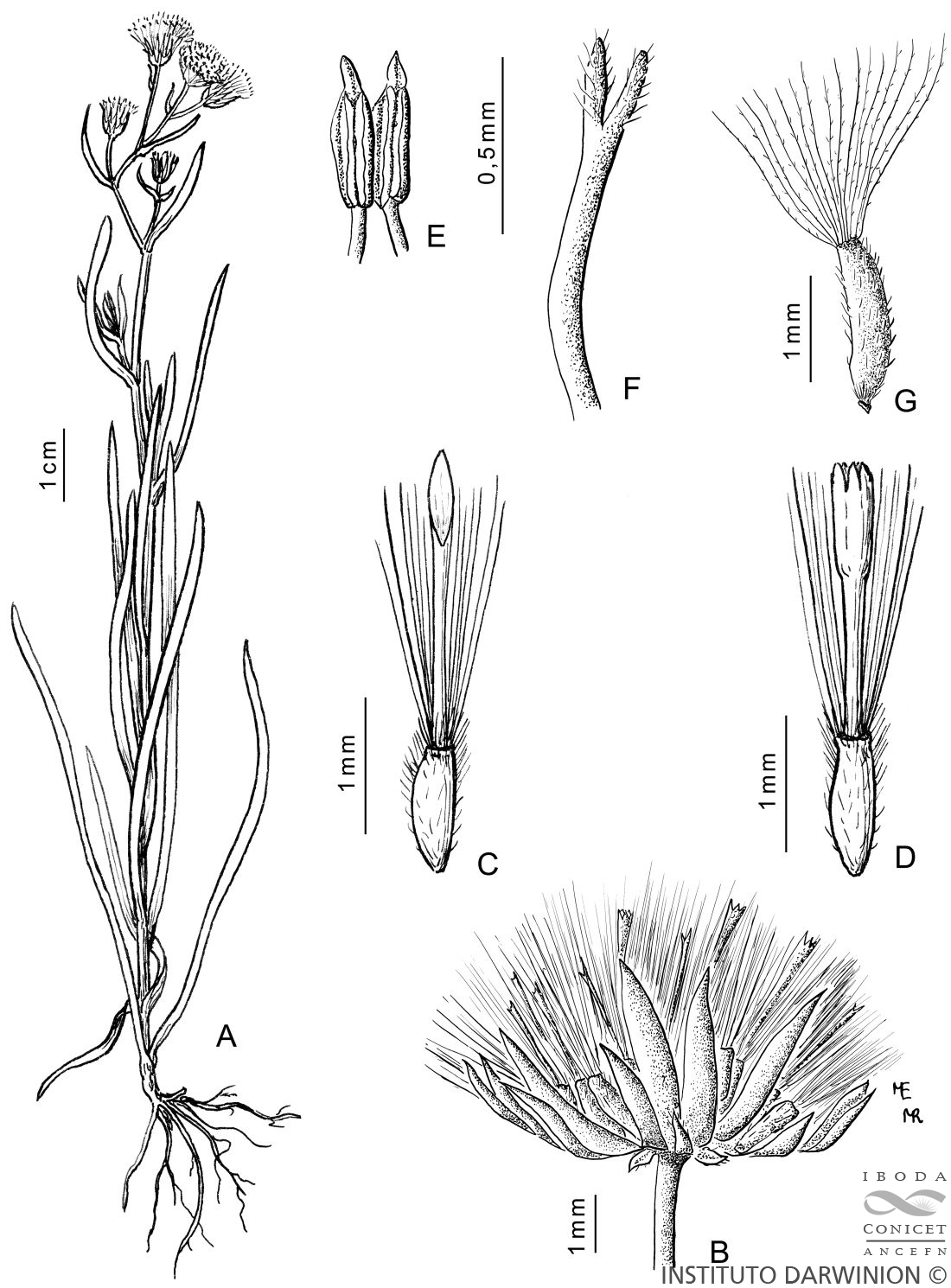 Hierbas anuales, hasta de 30(-35) cm de alto; raíces fasciculadas pequeñas; tallos ramificados sólo en la base, hojosos, glabros. Hojas uniformemente distribuidas en el tallo, estrechamente lineares, de 1,5-10 cm × 0,5-2,5 mm, base atenuada, ápice subagudo, margen entero, glabras, las superiores de similar tamaño a gradualmente menores. Capítulos 3 a ca. 15 por eje, de 3-5 × 4-6 mm, pedunculados, dispuestos en inflorescencias secundarias corimbiformes laxas. Involucro hemisférico con filarios gradualmente menores, dispuestos en 3 series, linearovados, de 2,2-3,5 × 0,4-0,5 mm, agudos, glabros. Flores marginales en 3 series, con corola filiforme, de 2-3 mm de largo, apenas más larga que los filarios, con limbo corto (ca. 0,5 mm), ápice entero; flores del centro pocas, con corola tubulosoinfundibuliforme, ca. 2 mm de largo. Aquenios ca. 1,5 × 0,5 mm, laxamente seríceos. Papus de 1,7-2 mm de largo.