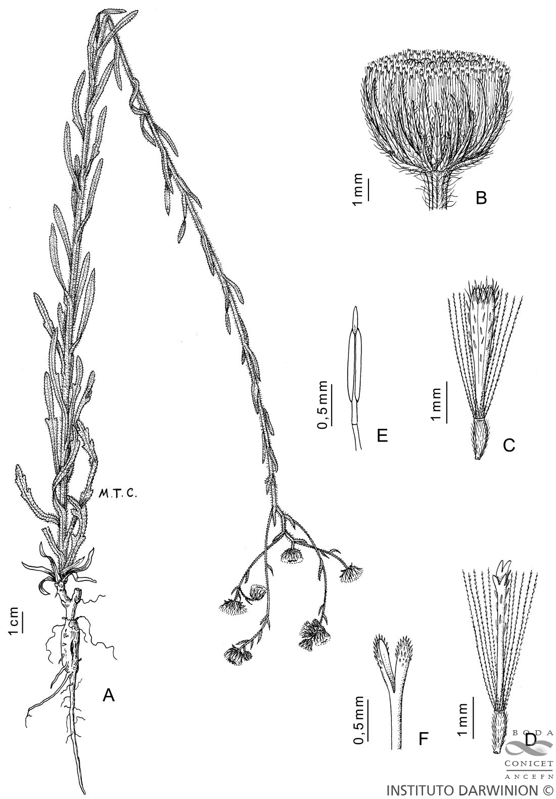 Hierbas perennes, hasta de 70 cm de alto; raíz principal desarrollada y gruesa; tallos simples, laxamente hojosos, hirsutolanosos. Hojas densamente hirsutas; las inferiores muchas veces concentradas en la base, obovadas u oblongas, de 30-95 × 6-18 mm, base atenuada, ápice subobtuso, margen serrado o lobado especialmente en el tercio superior, las superiores linearoblongas, reducidas (de 10-30 × 1-3 mm), esparcidas, algo abrazadoras, margen entero. Capítulos usualmente 5-10 por eje, a veces más numerosos, de 6-8 × 7-8 mm, pedunculados, formando en conjunto una inflorescencia secundaria corimbiforme más o menos densa. Involucro hemisférico con filarios subiguales dispuestos en 2 ó 3 series, lineares, de 5-6,5 × 0,6-0,7 mm, agudos, hirsutos, si la tercer serie presente, la externa más corta. Flores marginales en 6 series, con corola filiforme, de 3,7-4 mm de largo, apenas más larga que los filarios, limbo apenas desarrollado, ca. 0,6 mm de largo, ápice dentado; flores del centro relativamente numerosas, con corola tubuloso-campanulada, de 3,6-3,7 mm de largo. Aquenios de 2-2,3 × 0,4-0,5 mm, laxamente seríceos. Papus de 3,5-3,7 mm de largo.