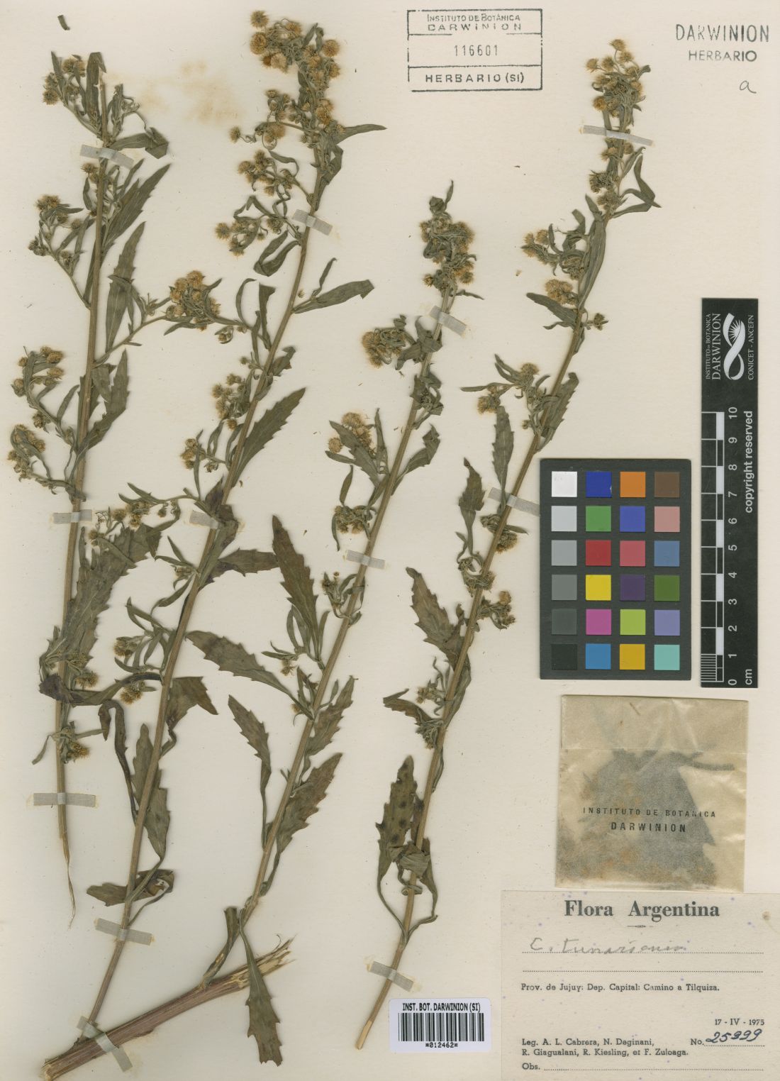 Hierbas anuales, hasta de 1 m de alto; raíz principal desarrollada; tallos usualmente únicos, ramificados, hojosos, hirsutos. Hojas sésiles, obovado-elípticas o elípticas, base atenuada y algo auriculadas, ápice subagudo, hirsutas en ambas caras, las inferiores de 5-10 cm × 1,5-20 mm, márgen serrado o lobado, las superiores algo menores que las inferiores, enteras o esparcidamente serradas. Capítulos usualmente más de 30 por eje, ca. 4 × 4-5 mm, pedunculados, agrupados de a pocos en la axila de las hojas y formando en conjunto una pseudopanícula amplia y foliosa. Involucro hemisférico, formado por filarios subiguales, dispuestos en 2 ó 3 series, linear-ovados, de 2,9-3,5 × 0,5-0,9 mm, agudos e hirsutos. Flores marginales en 4(-5) series, con corola filiforme, de 2,3-2,6 mm de largo, de igual longitud o apenas más larga que los filarios, con limbo corto (ca. 0,5 mm), ápice 2-lobado; flores del centro pocas, con corola tubulosoinfundibuliforme, de 2,5-3 mm de largo. Aquenios de 0,9-1 × 0,3-0,4 mm, laxamente seríceos a subglabros. Papus de 2,3-2,5 mm de largo.