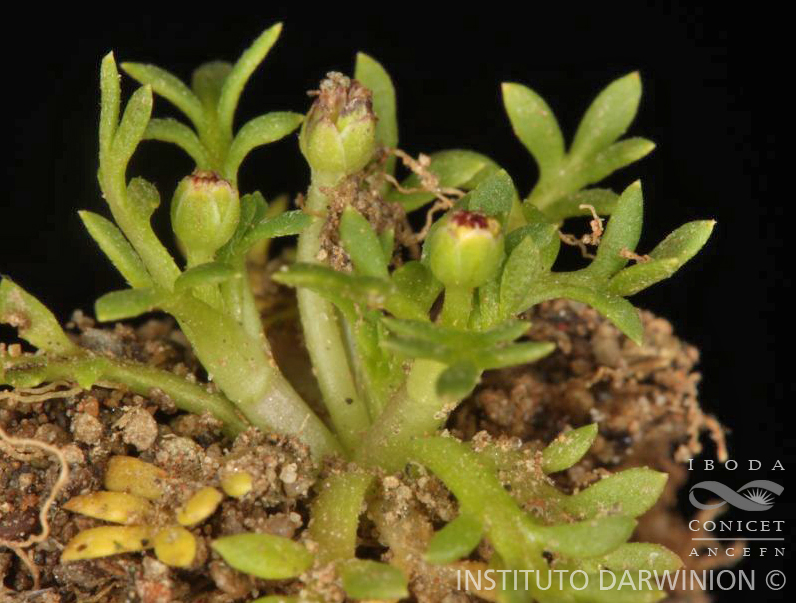 Hierbas pequeñas, rastreras, ca. 5 cm de largo, radicantes en los nudos, glabras o con pocos pelos largos y blandos. Hojas arrosetadas en los nudos, pecioladas, con la base del pecíolo membranácea y envainadora, pinnatisectas, de 10-33 × 5-12 mm, segmentos elípticos u obovados, obtusos o subobtusos, mucronados, a veces segmentos con 1(-2) dientes. Capítulos pequeños, solitarios, sobre pedúnculos delgados, subdiscoides. Involucro semiesférico, de 1,5 × 2 mm; filarios 2-seriados, obtusos, escariosos. Receptáculo piloso, con restos de pedicelos florales persistentes. Flores dimorfas: las del margen pistiladas, desnudas; flores del centro pocas (ca. 3) estaminadas (por esterilidad del gineceo), con tubo corolino 3-lobulado, de 1-2 mm de largo. Estambres 3. Aquenios obovoides, lisos, 2-alados, de 1,5-3 mm de largo.