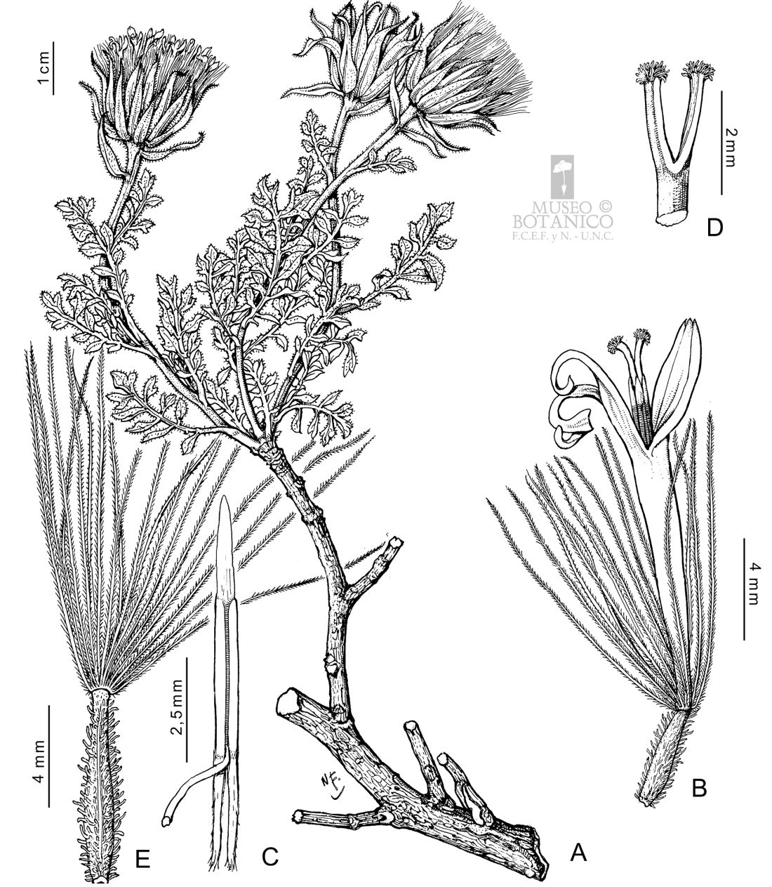 A. Rama florífera. B. Flor. C. Estambre. D. Parte superior del estilo. E. Aquenio y papus.