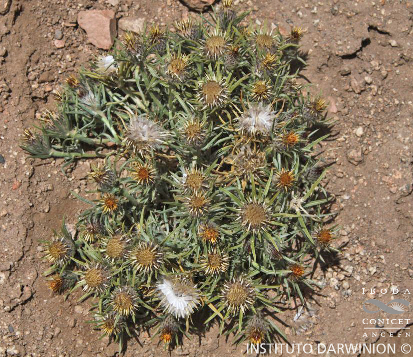 Hierbas hasta de 8 cm de alto, ramificada desde la base, con espinas axilares. Hojas de 28-35 × 1.5-3 mm, con haz seríceo y envés glabro. Capítulos de 2,5-3,5 × 1.5-3 cm. Filarios exteriores linear-lanceolados, erectos, mucronados. Receptáculo plano. Flores del margen ca. 10, con corolas de 6-9 mm de largo, las del centro 30-40, con corolas de 8-9 mm de largo. Anteras con apéndice conectival agudo o raro apiculado. Estilo cortamente bífido y papiloso. Aquenios vellosos, de 4,5-6 mm de largo. Papus 1- seriado, plumoso, de 5-7 mm de largo.