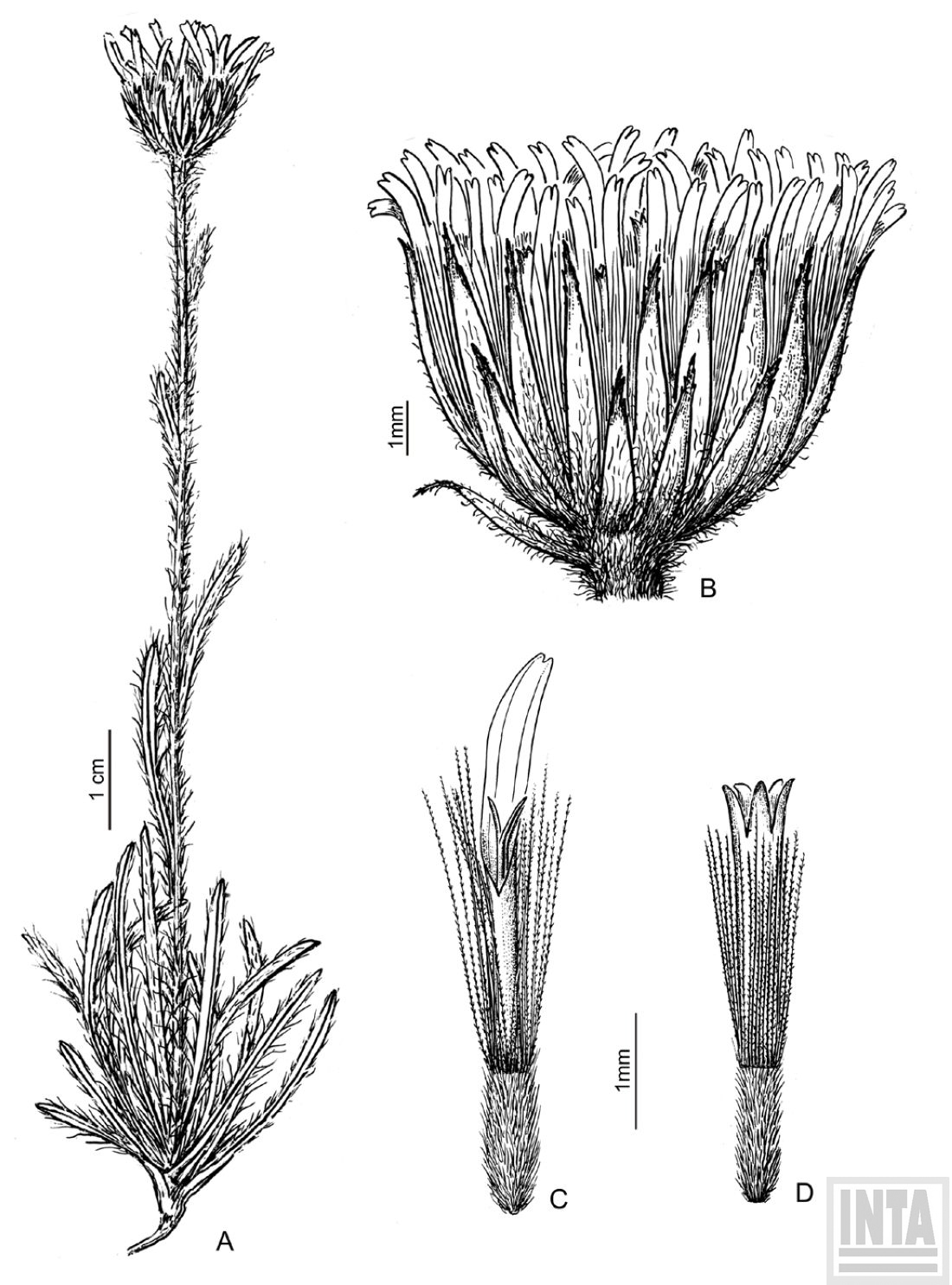 Hierbas perennes, rizomatosas, pequeñas, hasta de 10 cm de alto, con tallos simples, hojosos en la base, hirsutos. Hojas estrechamente lineares o linear-obovadas, de 2-3,5 cm × 1-4 mm, base largamente atenuada en un pseudopecíolo, ápice agudo, margen entero, subglabras e hirsutas en el margen; hojas superiores muy esparcidas, pocas, lineares, de menor tamaño que las inferiores. Capítulos radiados, solitarios, pedunculados, ca. 7 × ca. 8 mm. Involucro hemisférico; filarios desiguales dispuestos en 2 ó 3 series, ovado-lineares, de 3,2-5,9 × 0,5-0,8 mm, agudos, laxamente hirsutos, a veces rojizos en el ápice. Flores del margen dispuestas en 1 serie, corolas blancas, de 5-5,8 mm de largo, limbo de 2,5-4 × ca. 0,3 mm; flores del centro con corolas ca. 3 mm de largo. Aquenios oblongo-elipsoides, ca. 1,7 × ca. 0,5 mm, comprimidos, con 2(-3) nervios, seríceos. Papus formado por cerdas escabrosas ca. 3 mm de largo.