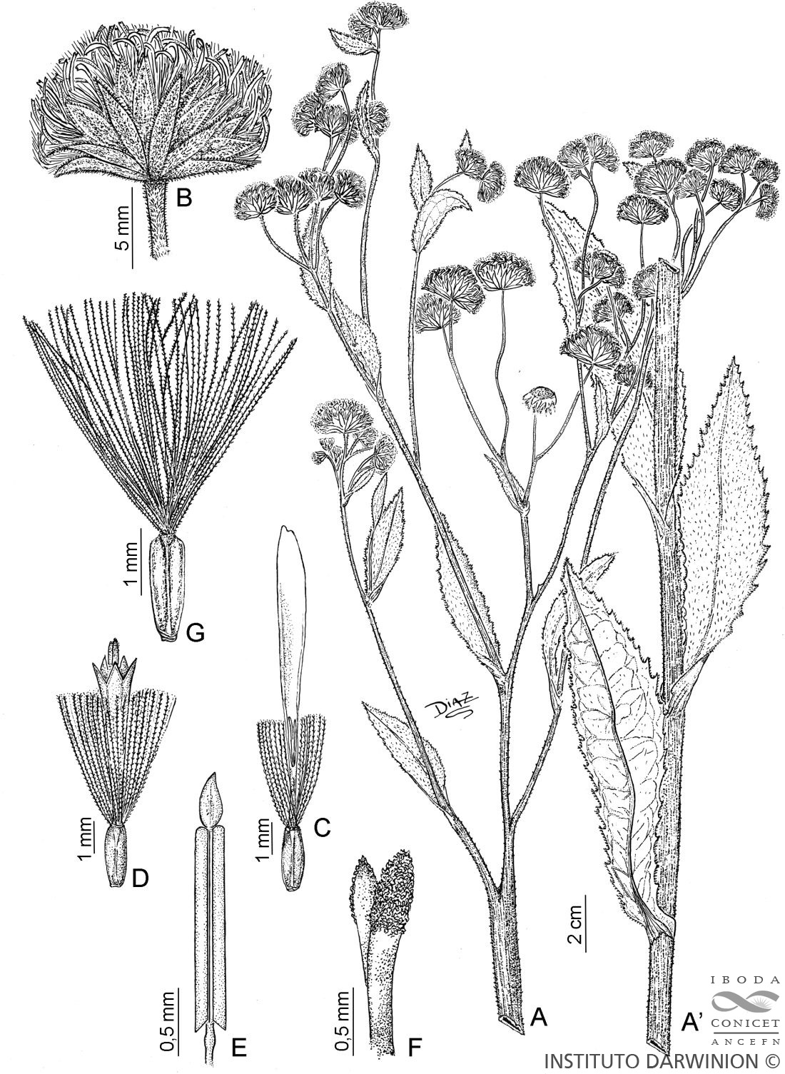 Hierbas perennes, hasta de 1,5 m de alto; rizomatosas; tallos generalmente simples, ramificados en el ápice, hojosos, laxamente estrigosos o glabros. Hojas sésiles o pecioladas, elípticas, 6-30 × 2-3,5 cm, base atenuada luego auriculada, especialmente en las superiores, ápice agudo, glabras en ambas caras o laxamente estrigosas, muchas veces con pelos glandulares, margen irregularmente serrado; las superiores de menor tamaño y margen entero. Capítulos pedunculados, usualmente más de 10, dispuestos en inflorescencias secundarias corimbiformes laxas, de 7-10 × 15-20 mm. Involucro hemisférico, con filarios subiguales dispuestos en 1 ó 2 series, angostamente ovados a lineares, de 6-9,2 × 1-1,2 mm, agudos e hirsutos. Flores marginales en 2 series, con corola blanca, de 9,8-16 mm de largo, con limbo linear de 8-15 mm de largo; flores del centro con corola de 3,9-5,3 mm de largo. Aquenios ca. 2 × 0,5-0,6 mm, glabros. Papus de 3,5-4,5 mm de largo.