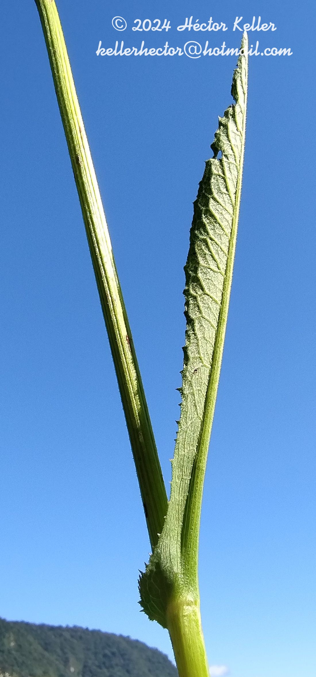 Hierbas perennes, hasta de 1,5 m de alto; rizomatosas; tallos generalmente simples, ramificados en el ápice, hojosos, laxamente estrigosos o glabros. Hojas sésiles o pecioladas, elípticas, 6-30 × 2-3,5 cm, base atenuada luego auriculada, especialmente en las superiores, ápice agudo, glabras en ambas caras o laxamente estrigosas, muchas veces con pelos glandulares, margen irregularmente serrado; las superiores de menor tamaño y margen entero. Capítulos pedunculados, usualmente más de 10, dispuestos en inflorescencias secundarias corimbiformes laxas, de 7-10 × 15-20 mm. Involucro hemisférico, con filarios subiguales dispuestos en 1 ó 2 series, angostamente ovados a lineares, de 6-9,2 × 1-1,2 mm, agudos e hirsutos. Flores marginales en 2 series, con corola blanca, de 9,8-16 mm de largo, con limbo linear de 8-15 mm de largo; flores del centro con corola de 3,9-5,3 mm de largo. Aquenios ca. 2 × 0,5-0,6 mm, glabros. Papus de 3,5-4,5 mm de largo.