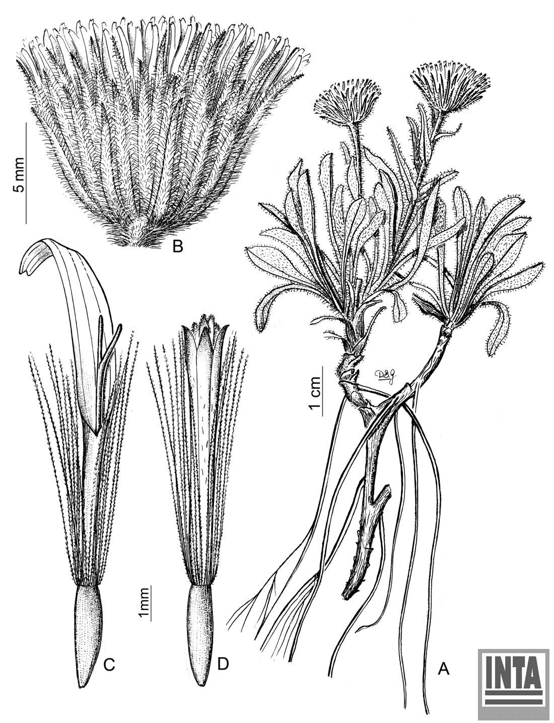 Hierbas perennes, rizomatosas, pequeñas, hasta de 5 cm de alto, con tallos escapiformes, hojosos en la base, hirsutos. Hojas rosuladas, espatuladas, de 7-25 × 3-8 mm, base largamente atenuada en un pseudopecíolo, ápice obtuso o subobtuso, margen entero, hirsutas; hojas superiores pocas, esparcidas, lineares, reducidas. Capítulos radiados, solitarios, pedunculados, de 8-10 × 10-12 mm. Involucro hemisférico; filarios subiguales, dispuestos en 2 ó 3 series, linear-ovados, de 5-8 × 0,8-1,2 mm, agudos, hirsutos. Flores del margen dispuestas en 1 serie, corolas blanco-rosadas, ca. 5 mm de largo, limbo ca. 4 × ca. 0,6 mm; flores del centro con corolas de 4,6-5 mm de largo. Aquenios oblongoelipsoides, de 2,3-3 × ca. 0,5 mm, comprimidos, con 2(-3) nervios, glabros. Papus formado por cerdas escabrosas de 4-5,5 mm de largo.