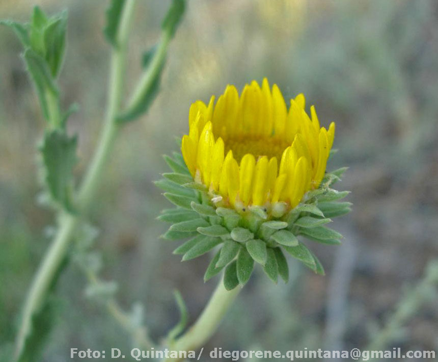 Subarbustos de 10-20(-100) cm de alto, muy ramificados. Tallos postrados, leñosos, de cuyos nudos nacen tallos herbáceos ascendentes, con pubescencia densa formada por tricomas simples. Hojas sésiles, angostamente elípticas a elípticas, de 10-30 × 1-6 mm, con base abrazadora y ápice agudo, margen entero, dentado o aserrado, cuando dentado o aserrado con dientes espinulosos, con pubescencia densa en ambas caras, formada por tricomas simples, cortos, rígidos y a veces por tricomas glandulares estipitados. Capítulos radiados, de 15-24 mm de diámetro. Involucro hemisférico, de 7-9 × 10-15 mm, con 6- 7 series de filarios subiguales, los externos angostamente triangulares a triangulares, herbáceos, de 3,5-6 × 0,5-1,3 mm, de ápice mucronado, densamente pubescentes; los internos elípticos, herbáceos con la base algo esclerificada, de 5-8 × 1-1,5 mm, acuminados, con tricomas simples, ralos y abundantes tricomas glandulares sésiles en la porción distal. Flores dimorfas, las marginales con corola ligulada, limbo elíptico a linear-elíptico, 3-dentado, de 7-12 × 1-2,5 mm; las del centro con corola tubulosa de 4-5,5 mm de largo. Aquenios prismáticos, de 3-4 mm de largo, con un reborde en el ápice que se proyecta a modo de corona. Papus formado por 6-8 aristas de 3,7-5 mm de largo, con una cara plana, ciliadas.
