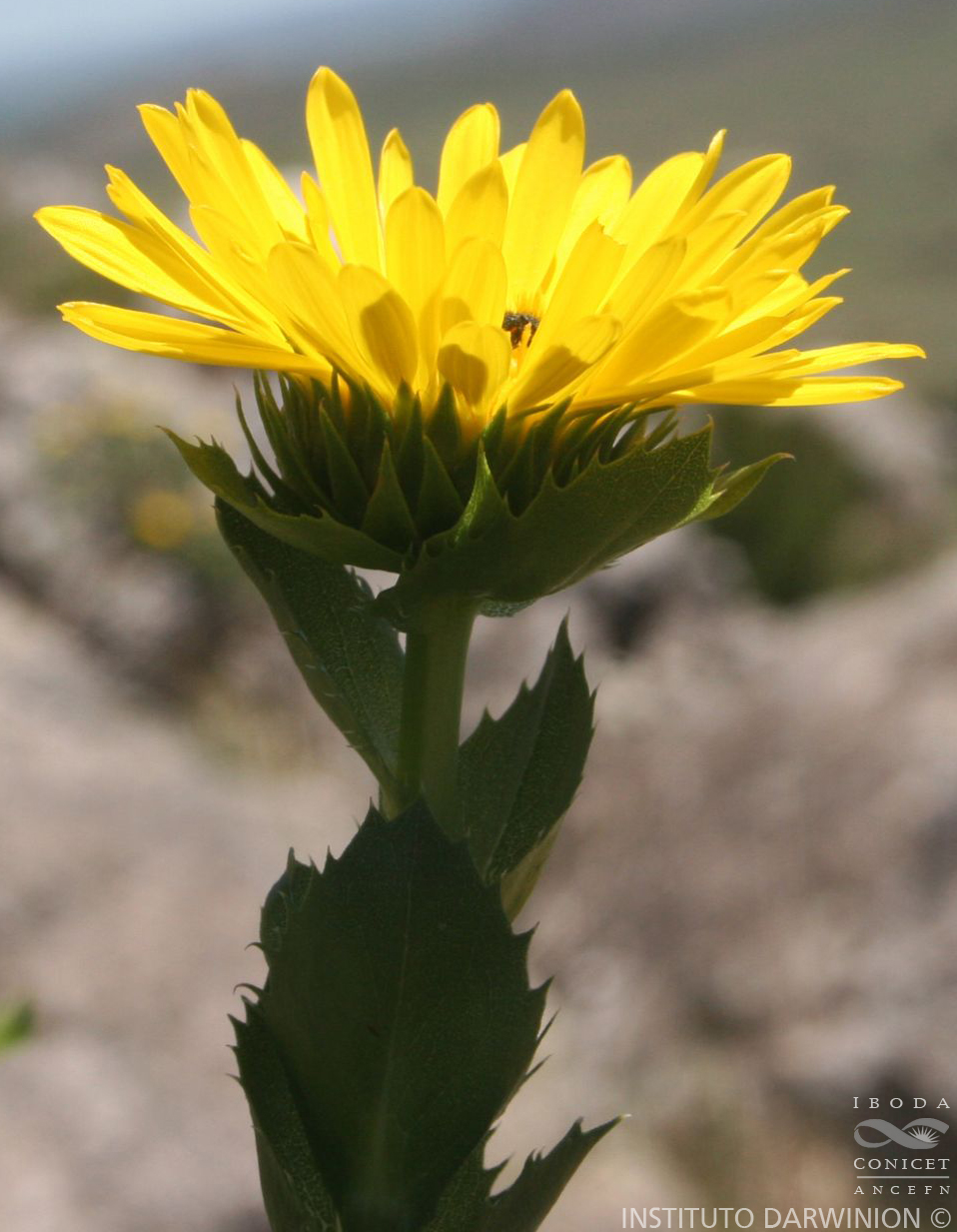 Arbustos de 80-120 cm de alto, muy ramificado. Tallos erectos, laxamente pubescentes, con 4-5 ramificaciones en la porción distal, hojosos hasta el ápice. Hojas basales con pseudopecíolo semiabrazador, obovadas o angostamente obovadas, de 40-90 × 15-40 mm, ápice obtuso, margen regularmente aserrado con numerosas aristas espinulosas curvas, a veces con escasos tricomas simples muy cortos y rígidos, tricomas glandulares sésiles o estipitados muy pequeños, en la superficie de ambas epidermis; las distales sésiles, dilatadas en la base, envolviendo frecuentemennte al capítulo. Capítulos radiados, ca. 60 mm de diámetro, agrupados. Involucro hemisférico, de 14-16 × 17-30 mm, con 6-7 series de filarios desiguales, los externos elípticos, de 7-9 × 1-2 mm, subulados, coriáceos; los internos elípticos, de 11-13 × 2-2,5 mm, tubulados, coriáceos, con tricomas simples, cortos, en los márgenes, y tricomas glandulares sésiles en toda la superficie. Flores dimorfas, las marginales con corola ligulada, limbo elíptico, 3-dentado, de 20-25 × 2-3 mm; las del centro con corola tubulosa de 6-7 mm de largo. Aquenios ovoides, comprimidos, de 6-7 mm de largo. Papus formado por ca. 15 aristas de 5,5-7 mm de largo, finamente ciliadas en los márgenes.