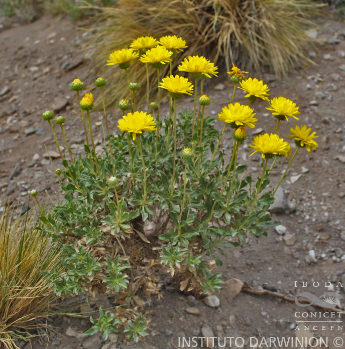 Subarbustos hasta de 1 m de alto, muy resinosos. Tallos erectos, hojosos en su parte distal. Hojas sésiles, con la lámina angostándose en un pseudopecíolo, elípticas o angostamente elípticas, de 33-91 × 7-21 mm, ápice obtuso a agudo, margen entero o dentado, cuando dentado los dientes se prolongan en una arista esclerosada, con tricomas glandulares sésiles semihundidos o hundidos en la epidermis. Capítulos radiados, de 30-65 mm de diámetro. Involucro hemisférico, de 10-18 × 11-20 mm, con 7-10 series de filarios desiguales, los externos angostamente triangulares, de 4-17 × 1-4 mm, acuminados, con el ápice a veces reflexo, con tricomas glandulares sésiles en toda su superficie; los internos anchamente elípticos, de 6-14 × 1,5-3 mm, acuminados, con márgenes membranáceos, con tricomas glandulares sésiles en la porción distal. Flores dimorfas, las marginales con corola ligulada, con limbo elíptico, 3-dentado, de 15-30 × 1,7-5,6 mm; las del centro con corola tubulosa de 6-10 mm de largo. Aquenios ovados, comprimidos, alados, de 5,5-6 mm de largo. Papus formado por 6-13 aristas de 6-13 mm de largo, paleáceas, apenas ciliadas en el margen.