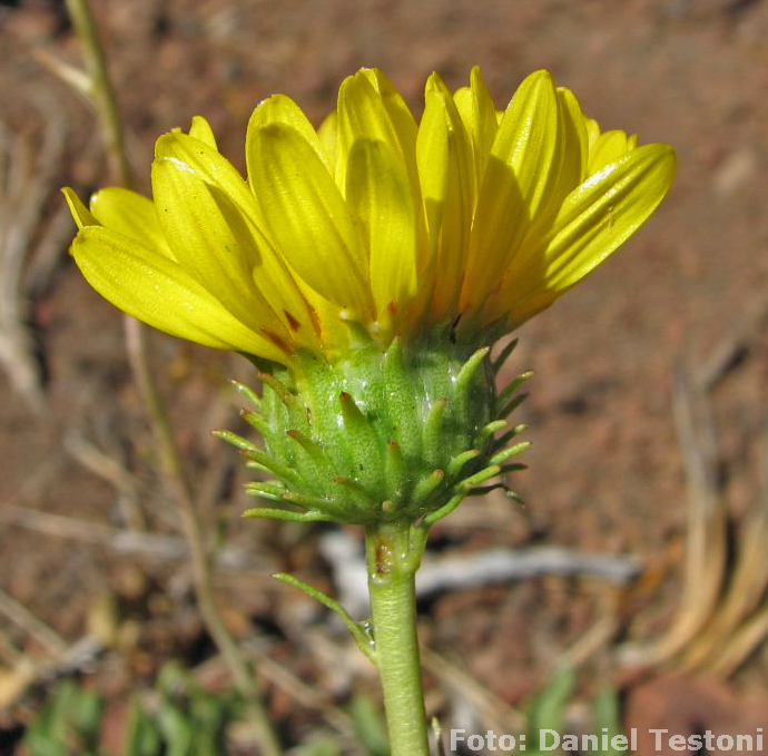 Subarbustos hasta de 1 m de alto, muy resinosos. Tallos erectos, hojosos en su parte distal. Hojas sésiles, con la lámina angostándose en un pseudopecíolo, elípticas o angostamente elípticas, de 33-91 × 7-21 mm, ápice obtuso a agudo, margen entero o dentado, cuando dentado los dientes se prolongan en una arista esclerosada, con tricomas glandulares sésiles semihundidos o hundidos en la epidermis. Capítulos radiados, de 30-65 mm de diámetro. Involucro hemisférico, de 10-18 × 11-20 mm, con 7-10 series de filarios desiguales, los externos angostamente triangulares, de 4-17 × 1-4 mm, acuminados, con el ápice a veces reflexo, con tricomas glandulares sésiles en toda su superficie; los internos anchamente elípticos, de 6-14 × 1,5-3 mm, acuminados, con márgenes membranáceos, con tricomas glandulares sésiles en la porción distal. Flores dimorfas, las marginales con corola ligulada, con limbo elíptico, 3-dentado, de 15-30 × 1,7-5,6 mm; las del centro con corola tubulosa de 6-10 mm de largo. Aquenios ovados, comprimidos, alados, de 5,5-6 mm de largo. Papus formado por 6-13 aristas de 6-13 mm de largo, paleáceas, apenas ciliadas en el margen.