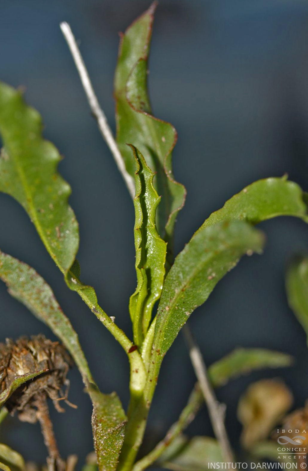 Subarbustos hasta de 1 m de alto, muy resinosos. Tallos erectos, hojosos en su parte distal. Hojas sésiles, con la lámina angostándose en un pseudopecíolo, elípticas o angostamente elípticas, de 33-91 × 7-21 mm, ápice obtuso a agudo, margen entero o dentado, cuando dentado los dientes se prolongan en una arista esclerosada, con tricomas glandulares sésiles semihundidos o hundidos en la epidermis. Capítulos radiados, de 30-65 mm de diámetro. Involucro hemisférico, de 10-18 × 11-20 mm, con 7-10 series de filarios desiguales, los externos angostamente triangulares, de 4-17 × 1-4 mm, acuminados, con el ápice a veces reflexo, con tricomas glandulares sésiles en toda su superficie; los internos anchamente elípticos, de 6-14 × 1,5-3 mm, acuminados, con márgenes membranáceos, con tricomas glandulares sésiles en la porción distal. Flores dimorfas, las marginales con corola ligulada, con limbo elíptico, 3-dentado, de 15-30 × 1,7-5,6 mm; las del centro con corola tubulosa de 6-10 mm de largo. Aquenios ovados, comprimidos, alados, de 5,5-6 mm de largo. Papus formado por 6-13 aristas de 6-13 mm de largo, paleáceas, apenas ciliadas en el margen.