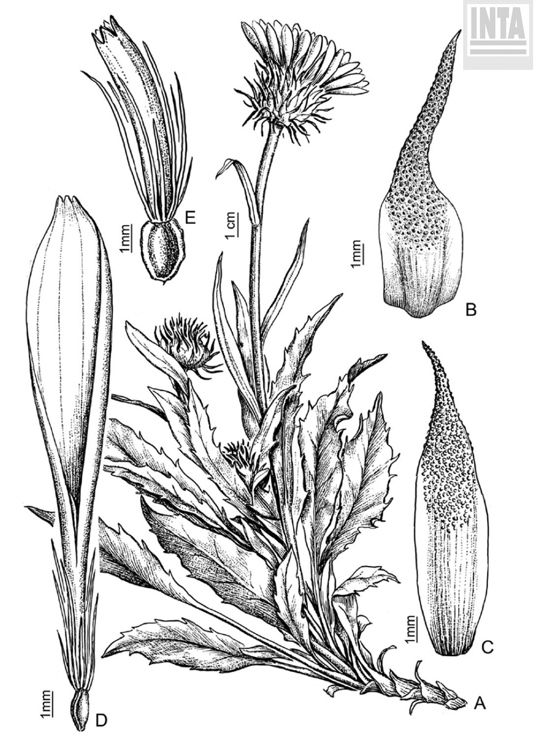 A. Planta. B. Filario externo. C. Filario interno. D. Flor del margen. E. Flor del centro.
