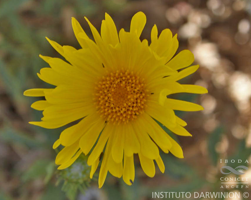 Subarbustos hasta de 1 m de alto, muy resinosos. Tallos erectos, hojosos en su parte distal. Hojas sésiles, con la lámina angostándose en un pseudopecíolo, elípticas o angostamente elípticas, de 33-91 × 7-21 mm, ápice obtuso a agudo, margen entero o dentado, cuando dentado los dientes se prolongan en una arista esclerosada, con tricomas glandulares sésiles semihundidos o hundidos en la epidermis. Capítulos radiados, de 30-65 mm de diámetro. Involucro hemisférico, de 10-18 × 11-20 mm, con 7-10 series de filarios desiguales, los externos angostamente triangulares, de 4-17 × 1-4 mm, acuminados, con el ápice a veces reflexo, con tricomas glandulares sésiles en toda su superficie; los internos anchamente elípticos, de 6-14 × 1,5-3 mm, acuminados, con márgenes membranáceos, con tricomas glandulares sésiles en la porción distal. Flores dimorfas, las marginales con corola ligulada, con limbo elíptico, 3-dentado, de 15-30 × 1,7-5,6 mm; las del centro con corola tubulosa de 6-10 mm de largo. Aquenios ovados, comprimidos, alados, de 5,5-6 mm de largo. Papus formado por 6-13 aristas de 6-13 mm de largo, paleáceas, apenas ciliadas en el margen.