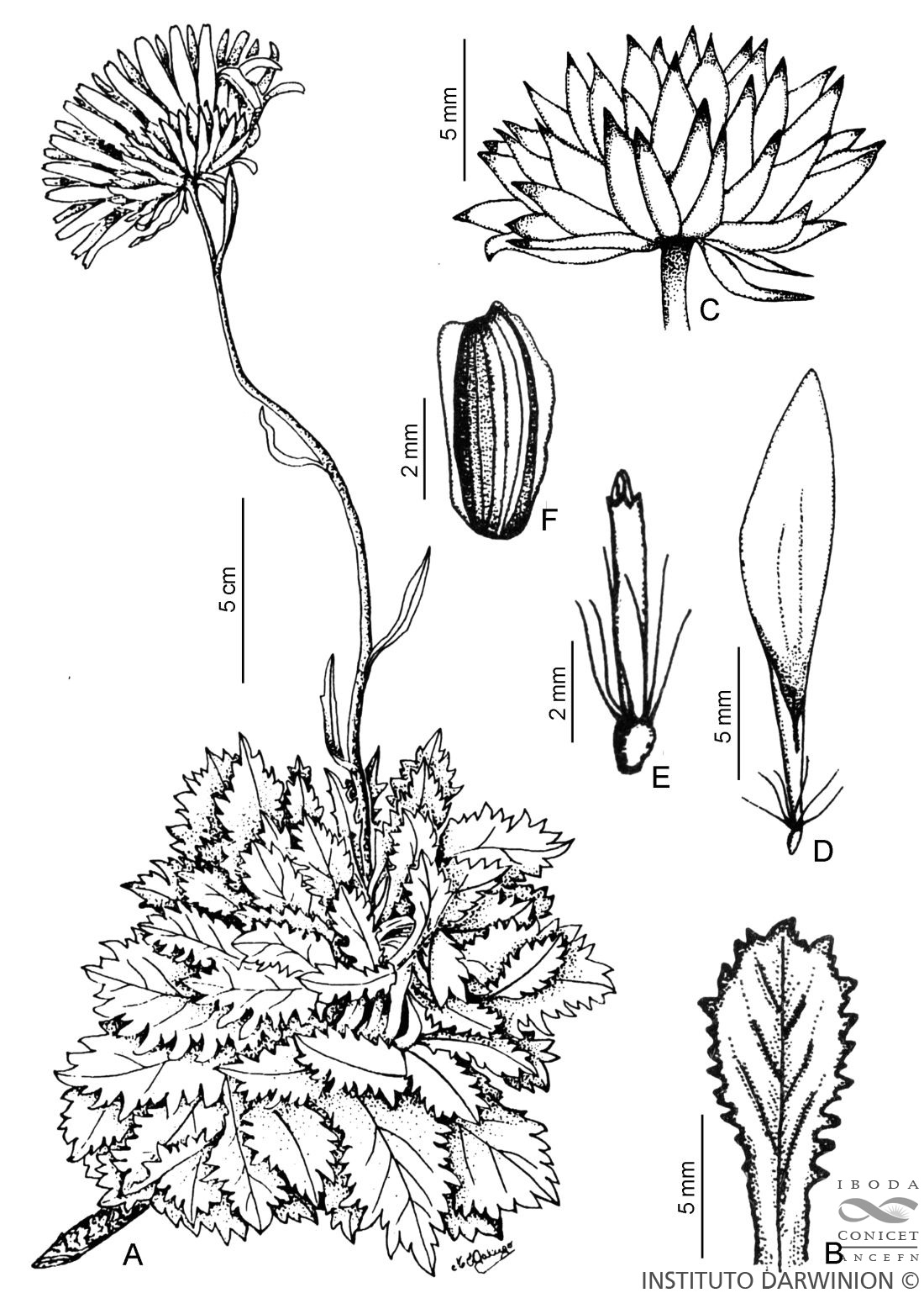 A. Planta. B. Hoja. C. Involucro. D. Flor del margen. E. Flor del centro. F. Aquenio.