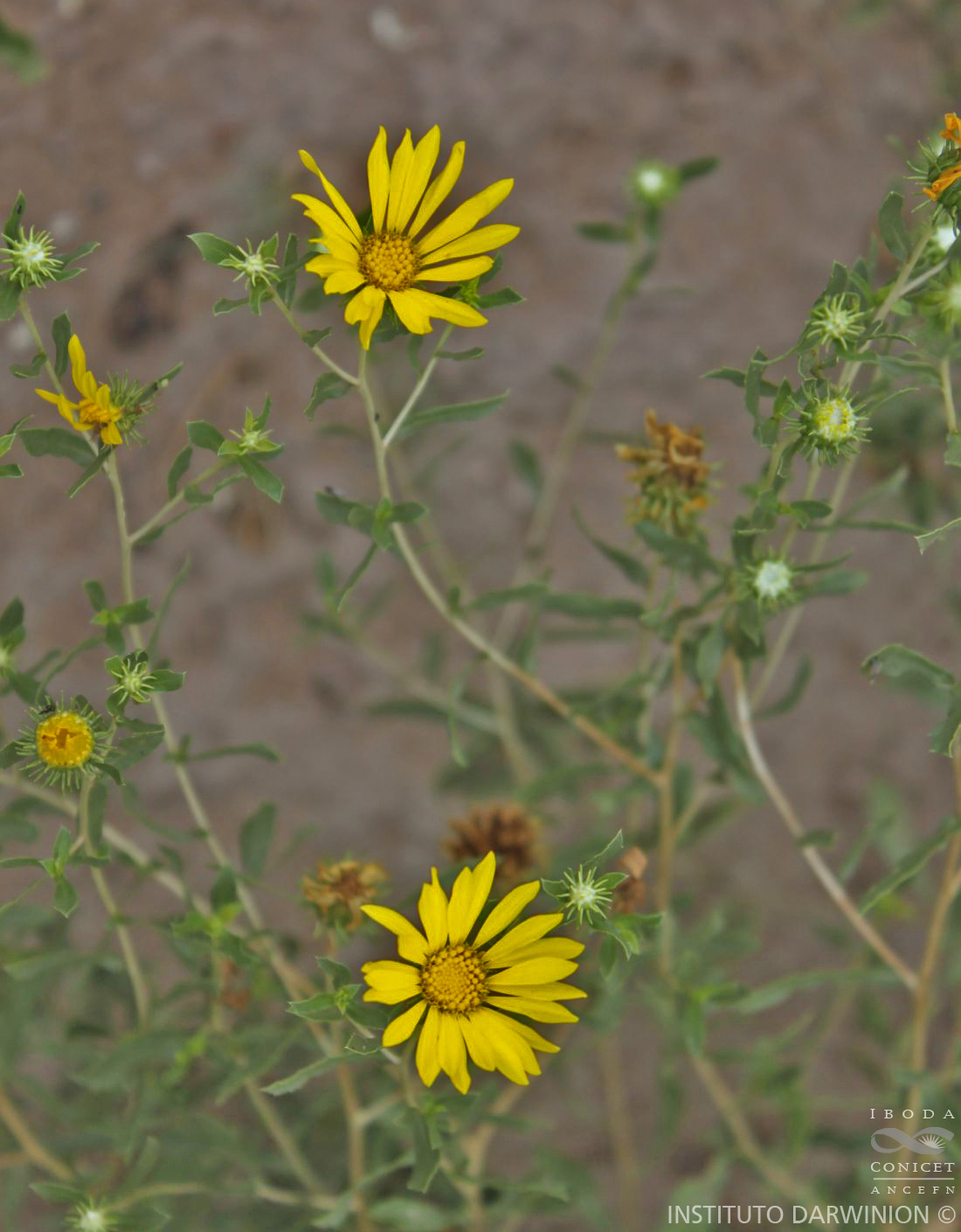 Subarbustos de 30-100 cm de alto. Tallos erectos, muy ramificados, hojosos hasta el ápice, con tricomas glandulares sésiles. Hojas sésiles, linear-elípticas a elípticas, de 25-65 × 5-15 mm, con tricomas glandulares sésiles en ambas caras y tricomas cortos, rígidos y arqueados, en los márgenes. Capítulos radiados o discoides, de 25-35 mm de diámetro. Involucro hemisférico, de 7-15 × 25-30 mm, con 7-9 series de filarios subiguales, los externos lineares con la base ensanchada, de 3-10 × 0,3-0,5 mm, acuminados, con tricomas glandulares en toda la superficie; los internos elípticos, de 4-7 × 1-1,5 mm, acuminados, con tricomas glandulares en la porción distal. Flores isomorfas o dimorfas, las marginales, cuando presentes, con corolas liguladas, limbo elíptico, 3-dentado, de 10-18 × 1,5-3,5 mm; las del centro con corola tubulosa de 5 mm de largo. Aquenios prismáticos, de 3,5 mm de largo, con un reborde en el ápice. Papus formado por 3-6 aristas, de 5 mm de largo, ciliadas, con una cara plana.