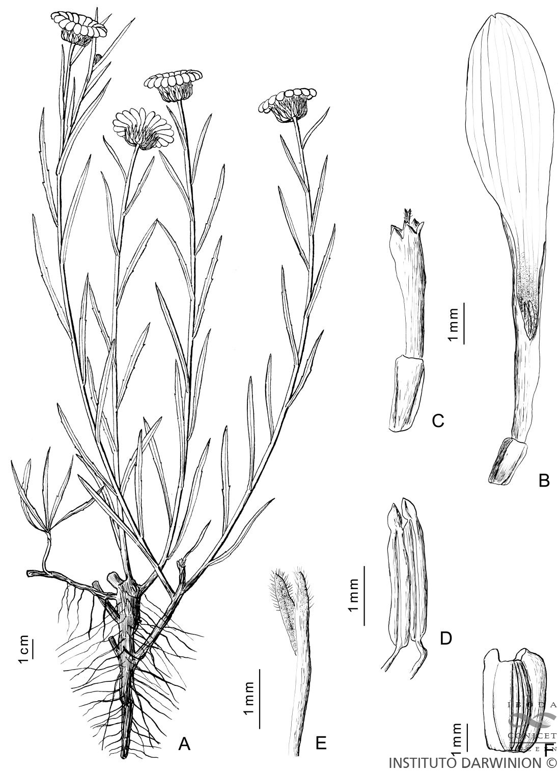 Subarbustos de 10-40 cm de alto. Tallos postrados leñosos, de cuyos nudos nacen tallos herbáceos ascendentes, generalmente glabros o con tricomas simples, largos y laxos espercidos. Hojas pecioladas, semiabrazadoras, angostamente elípticas, lobuladas, pinnatífidas o pinnatisectas, de 15-8 × 2-7 mm, ápice agudo, margen entero o paucidentado, glabras o con tricomas laxos en la lámina. Capítulos radiados de 15-40 mm de diámetro. Involucro hemisférico, de 10-11 × 11-15 mm, con 4-6 series de filarios subiguales, los externos lineares, de 5-12 × 1-2 mm, acuminados, mucronados, a veces con tricomas laxos; los internos oblongos, de 7,5-10 × 1,5-4 mm, acuminados, con tricomas glandulares en su porción distal. Flores dimorfas, las marginales con corola ligulada, limbo elíptico, 3-dentado, de 8-19 × 1-3- (4) mm; las del centro con corola tubulosa de 4-6 mm de largo. Aquenios prismáticos, de 3,0-4,5 mm de largo, con un reborde en la parte superior a modo de corona. Papus formado por 4-7 aristas caducas, subcapilares, de 4-6 mm de largo, aplanadas en una cara, con escasas cilias.