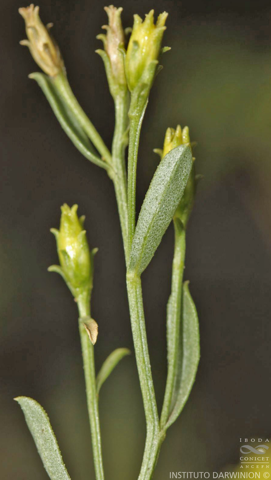 Arbustos rizomatosos, hasta de 100 cm de alto, con tallos ramificados, hojosos, glandulosos. Hojas lineares, de 10-35 × ca. 1 mm, base atenuada, ápice subagudo, margen entero, glabras. Capítulos solitarios, pedunculados, ca. 6 × ca. 3 mm. Involucro acampanado, de 5-6 mm de alto; filarios dispuestos en 3 series, ovado-oblongos, de 2-4,6 × 0,6-2,3 mm, ápice apiculado. Flores del margen con corolas blancas, a veces cremosas o amarillentas, ca. 5 mm de largo, limbo de 2,5-5 × 1-2 mm; flores del centro con corolas de 2,5-4 mm de largo; ramas del estilo lineares. Aquenios de 1,7-2,3 × ca. 1 mm, seríceos. Papus formado por pajitas angostas, las de las flores del centro de 1,5-2,5 mm de largo.