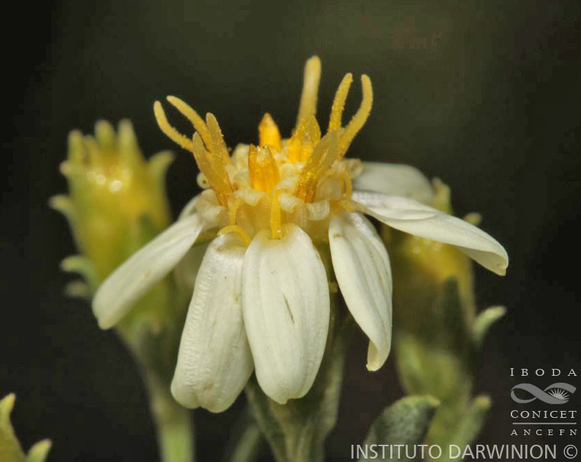 Arbustos rizomatosos, hasta de 100 cm de alto, con tallos ramificados, hojosos, glandulosos. Hojas lineares, de 10-35 × ca. 1 mm, base atenuada, ápice subagudo, margen entero, glabras. Capítulos solitarios, pedunculados, ca. 6 × ca. 3 mm. Involucro acampanado, de 5-6 mm de alto; filarios dispuestos en 3 series, ovado-oblongos, de 2-4,6 × 0,6-2,3 mm, ápice apiculado. Flores del margen con corolas blancas, a veces cremosas o amarillentas, ca. 5 mm de largo, limbo de 2,5-5 × 1-2 mm; flores del centro con corolas de 2,5-4 mm de largo; ramas del estilo lineares. Aquenios de 1,7-2,3 × ca. 1 mm, seríceos. Papus formado por pajitas angostas, las de las flores del centro de 1,5-2,5 mm de largo.
