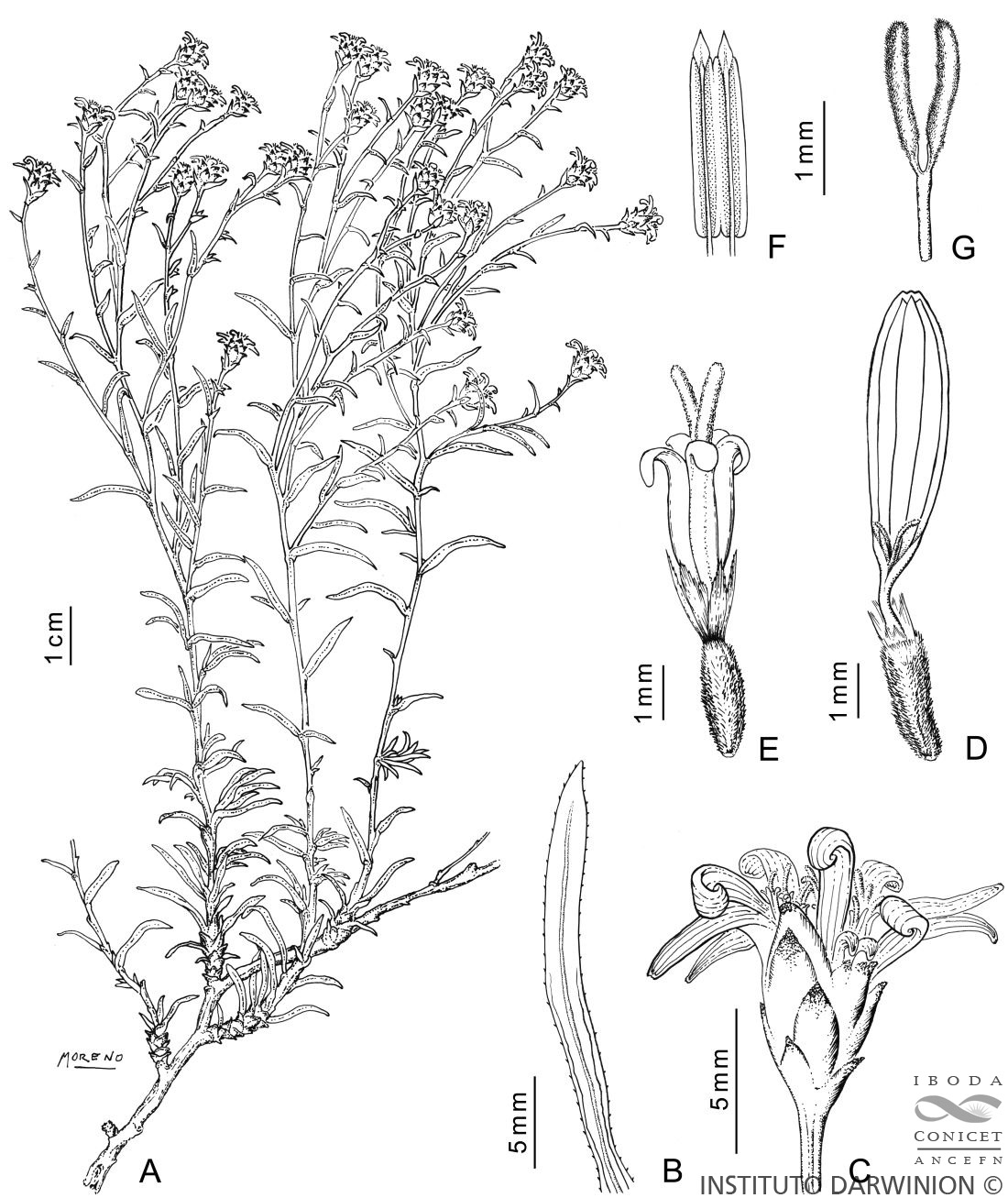 A. Planta. B. Hoja. C. Capítulo. D. Flor del margen. E. Flor del centro. F. Estambres. G. Estilo (sección).