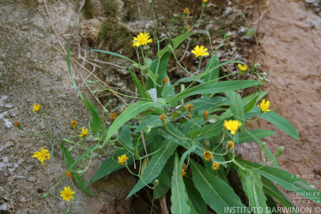 Hierbas perennes, rizomatosas de 40-70 cm de alto. Tallos ramificados, laxamente flocosos, con algunas cerdas y pelos glandulares cortos de base negra en la zona basal; en la parte superior la pilosidad aumenta y los pelos glandulares presentan distinta longitud. Hojas basales oblanceoladas, de 7-15 × 1,4-3 cm, atenuadas en largo pseudopecíolo, agudas u obtusas en el ápice, con dientes diminutos en el margen distantes entre sí; hojas superiores sésiles, semiamplexicaules, de ápice agudo; todas, con pelos glandulares pequeños, aislados, en haz y envés. Capítulos dispuestos en cimas corimbiformes paucicéfalas, laxas; pedúnculo e involucro flocosos y densamente glandulosos. Involucro acampanado, de 6-8 × 4 mm de alto; filarios linearlanceolados, subobtusos. Lígulas amarillas, no ciliadas, exertas, que superan en 1/3 la altura del involucro. Aquenios negros, ca. 3 mm de largo, espinulosos en la base. Papus ca. 5 mm de largo.