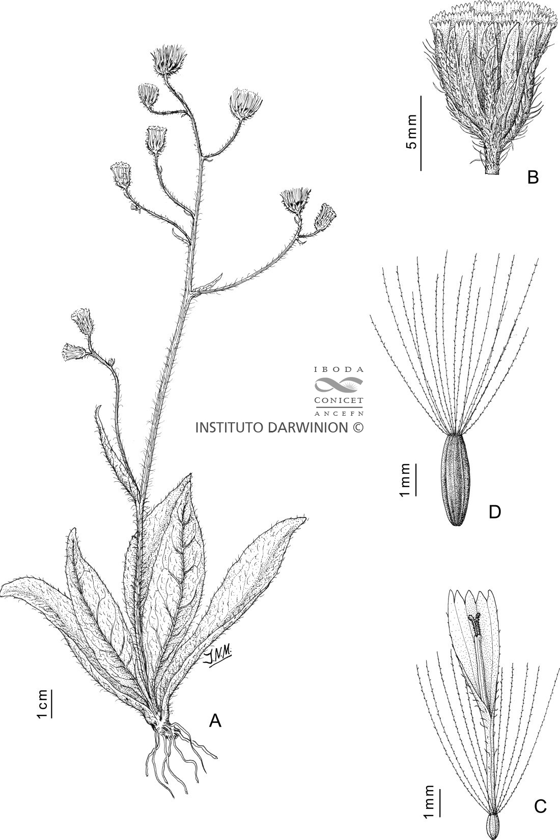 Hierbas perennes, rizomatosas, de 10-40 cm de alto. Tallos flocosos, hirsutos, provistos de cerdas largas. Hojas basales arrosetadas, elíptico-lanceoladas u oblanceoladas, de 6-10(12) × 1,5-2 cm, atenuadas en pseudopecíolo, agudas u obtusas en el ápice, enteras o ligeramente denticuladas, setosas en haz y envés (ocasionalmente, microglandulosas); hojas caulinares (1-2), lineares o linear-lanceoladas, mucho menores que las inferiores. Capítulos dispuestos en inflorescencias racemosas, paucicéfalas; pedúnculo e involucro flocosos con cerdas largas y algunos pelos glandulares entremezclados. Involucro cilíndrico-acampanado, de 8-10 × 6-8 mm; filarios lanceolado-lineares, agudos. Flores amarillas, con lígulas cortas, apenas sobresalientes del involucro. Aquenios negros, multicostados, ca. 3 mm de largo. Papus blanco o amarillento, ca. 5 mm de largo.